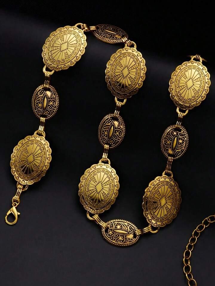 Design: A vintage-inspired metal body chain belt with bohemian flair, featuring delicate links designed to accentuate the waist over dresses and suits.