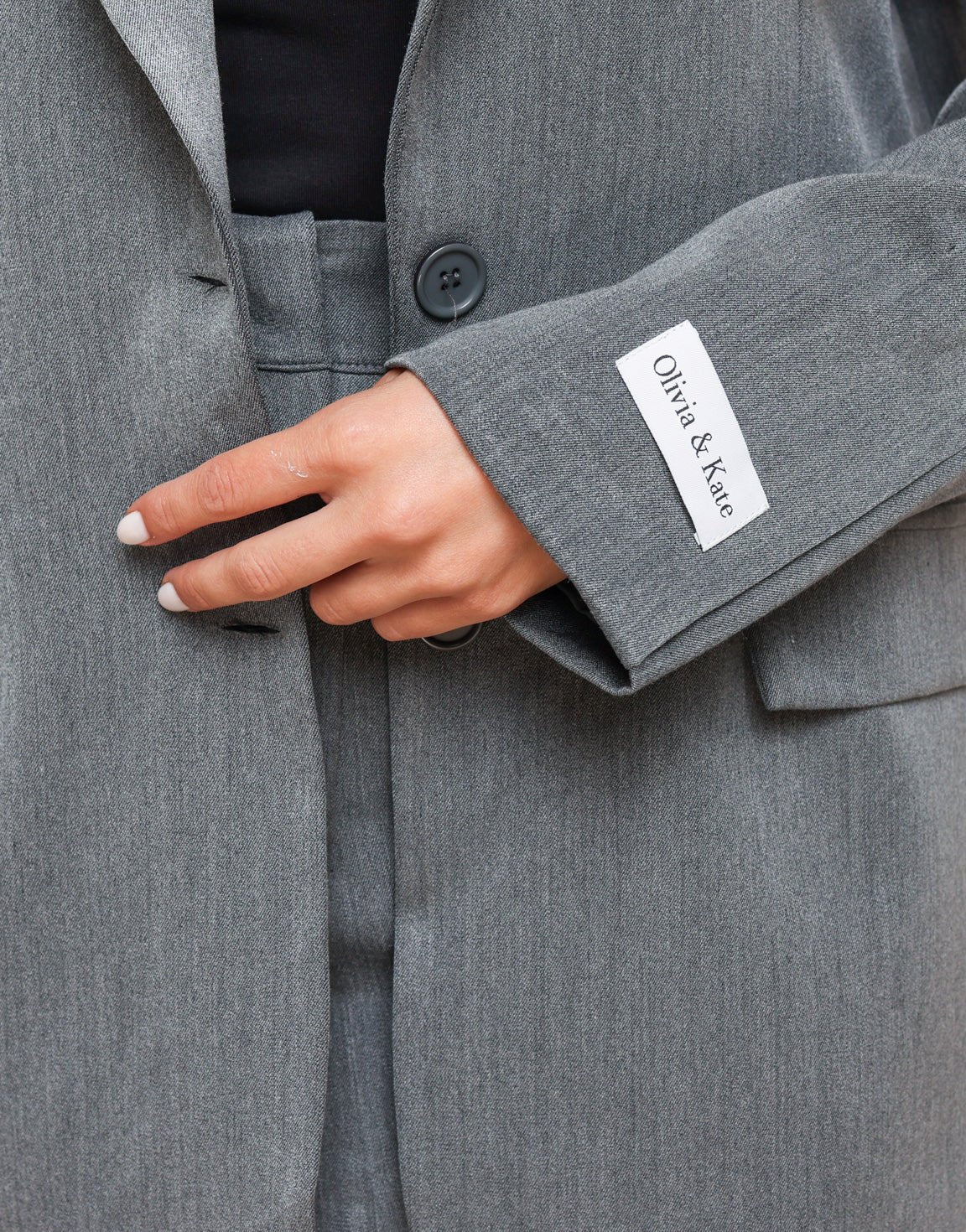 - Details: long sleeves / high collar / double lining / two fake pockets at the front / button closure at the front / Olivia & Kate label on the left sleeve / shoulder pads / slit at the back