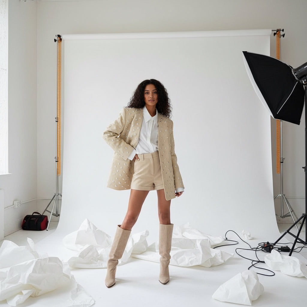 Turn heads with this crystal-embellished blazer, featuring structured shoulders, sharp lapels, and light-catching studs from shoulder to hem for a striking, polished silhouette. The neutral base adds versatility while the tailored design exudes confidence and sophistication.