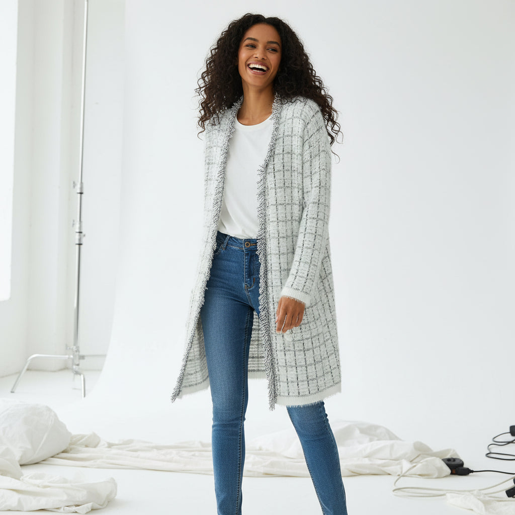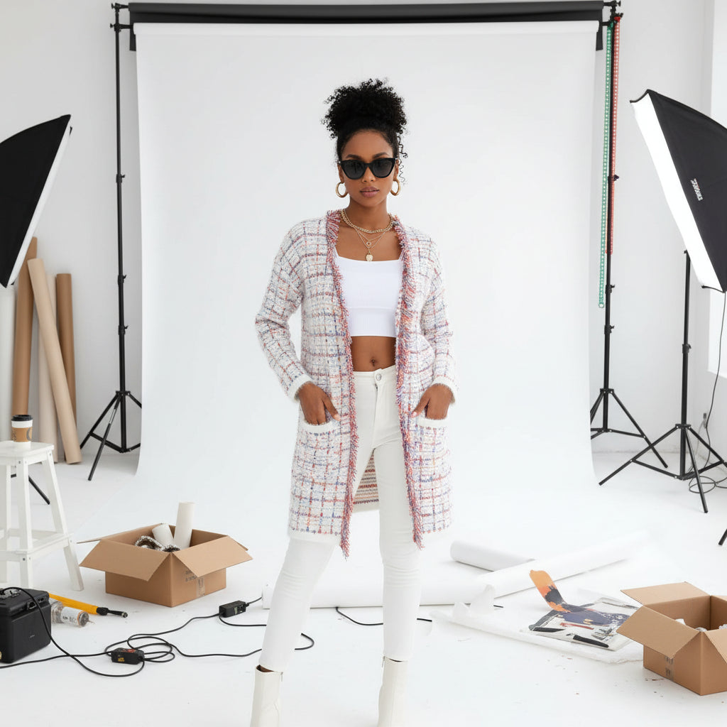 Step into polished charm with the Bellevue Tweed Fringe Cardigan, designed with a vibrant multicolour tweed weave and playful fringe trim for a fresh, modern edge. The textured knit and open-front longline silhouette create an effortlessly flattering shape, while the front patch pockets add a relaxed yet refined touch.