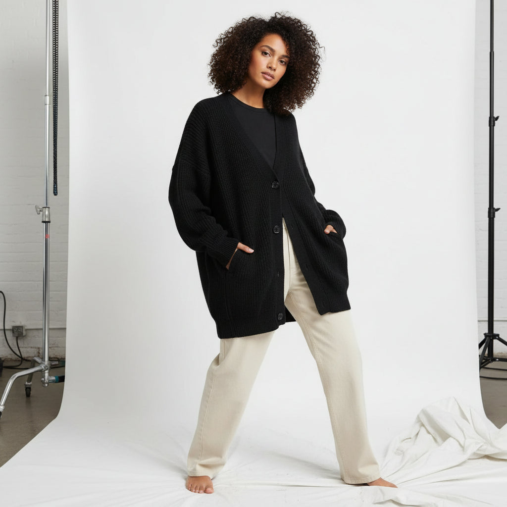The Ribbed Slouch Button Cardigan captures effortless comfort with a quietly polished feel. Designed in a soft rib-knit, it features a relaxed silhouette with dropped shoulders, a flattering V-neckline, and tonal button detailing that keeps the look clean and timeless. The easy drape gives it that perfectly undone charm while remaining versatile enough for everyday wear.