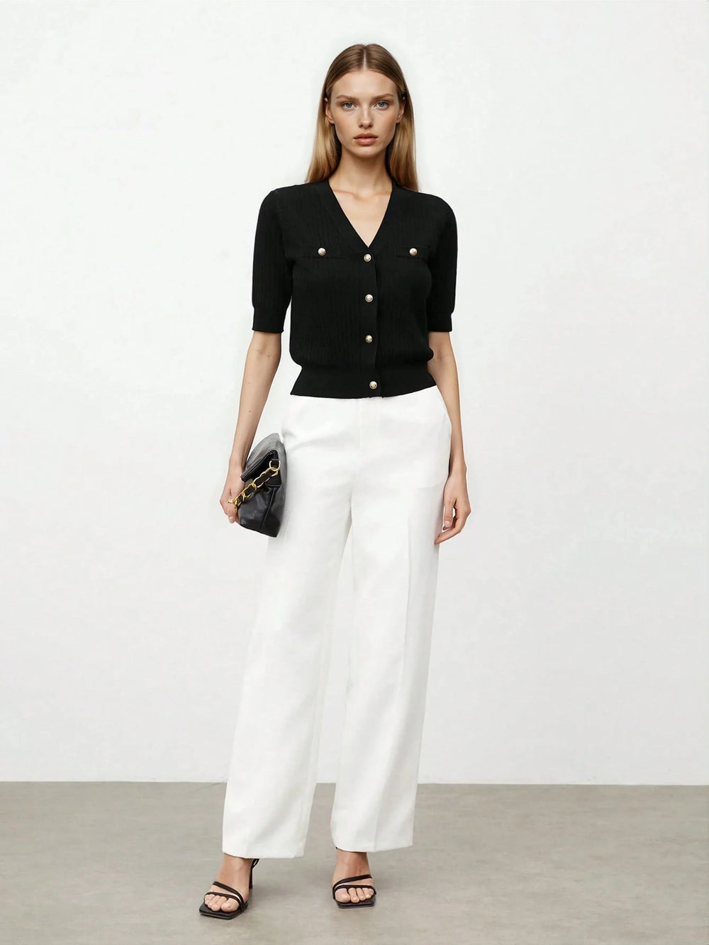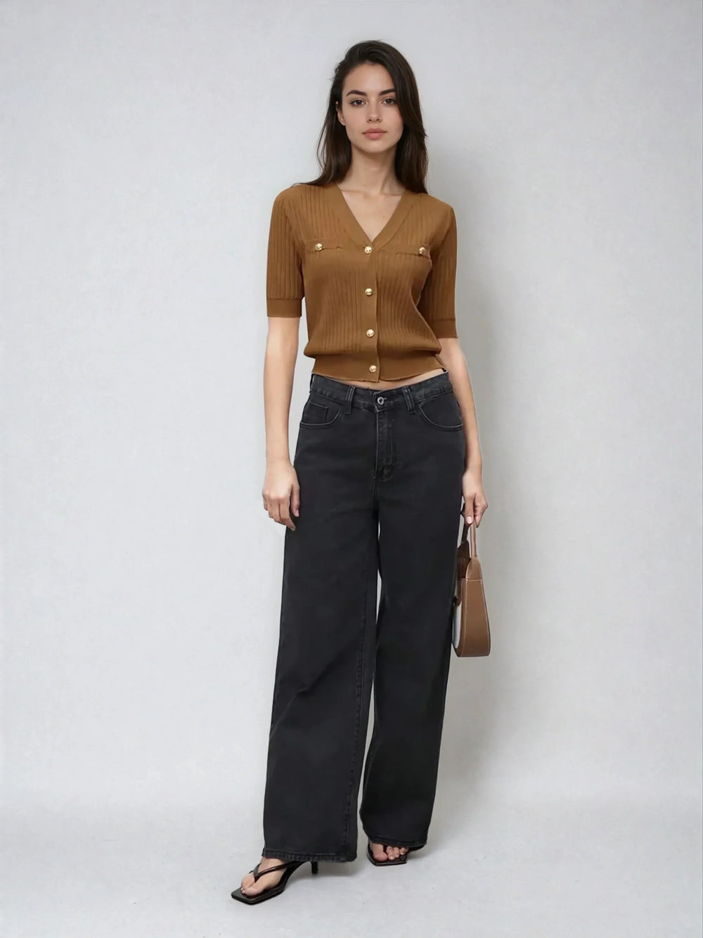 Chic V Neck Knit Sweater With Button Front Short Sleeve