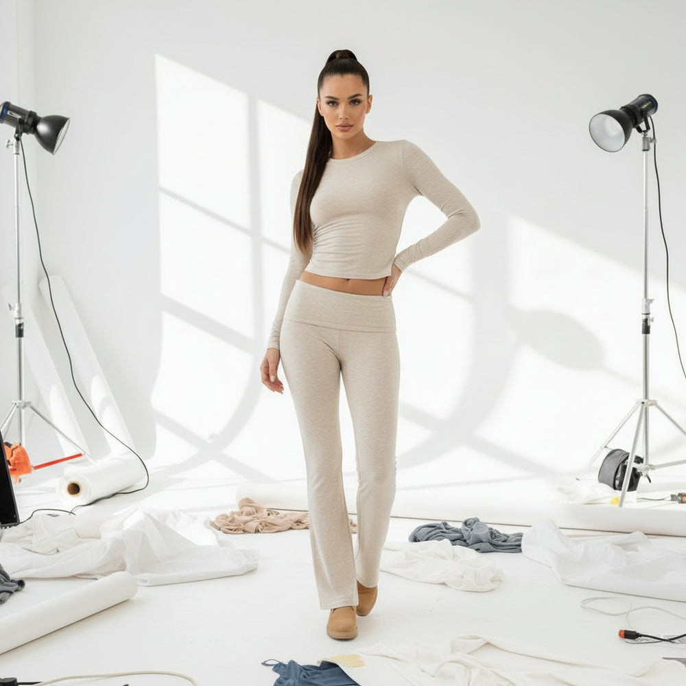 Stretch Crop Top & Flared Lounge Set - Light Grey