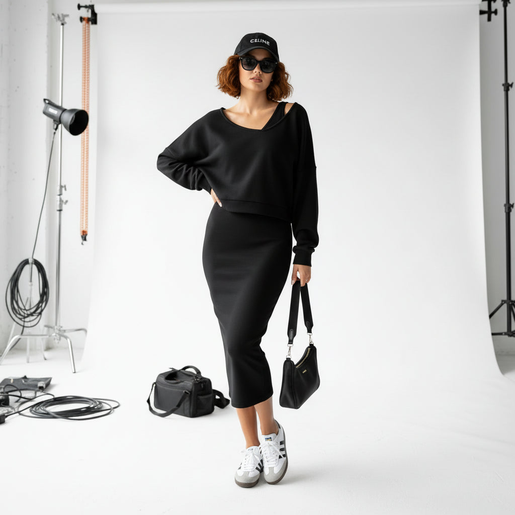 Stretch Crop Top & Flared Lounge Set - Dark Grey