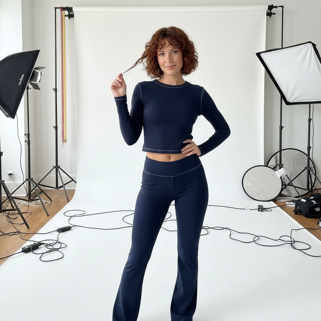 Stretch Crop Top & Flared Lounge Set - Dark Blue