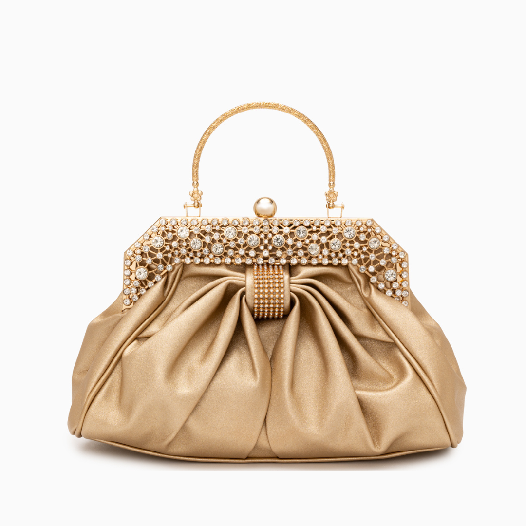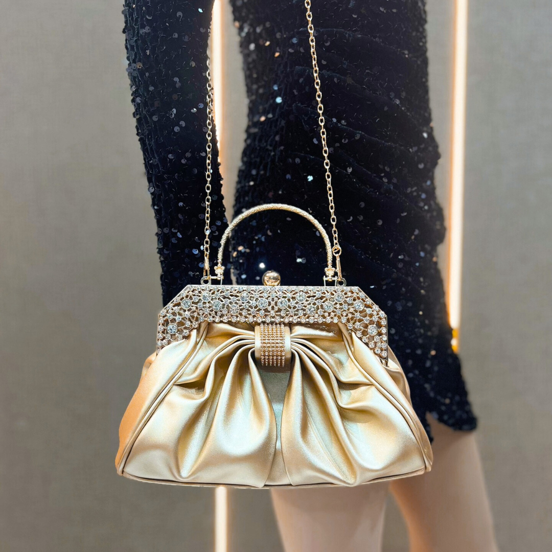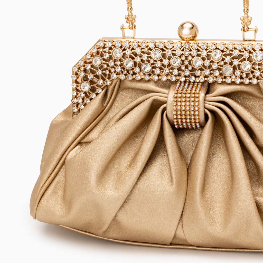 Timeless with a touch of modern drama, the Cagliari Embellished Frame Bag elevates your evening edit with ease. Its softly gathered silhouette is balanced by a sculpted metal frame adorned in delicate florals and sparkling crystal accents. The gold finish adds a refined contrast, while the rhinestone-encrusted top lends vintage charm. Whether held by hand or styled with a chain, this piece delivers statement style in every setting. Ideal for soirées, formal dinners, or unforgettable nights out.