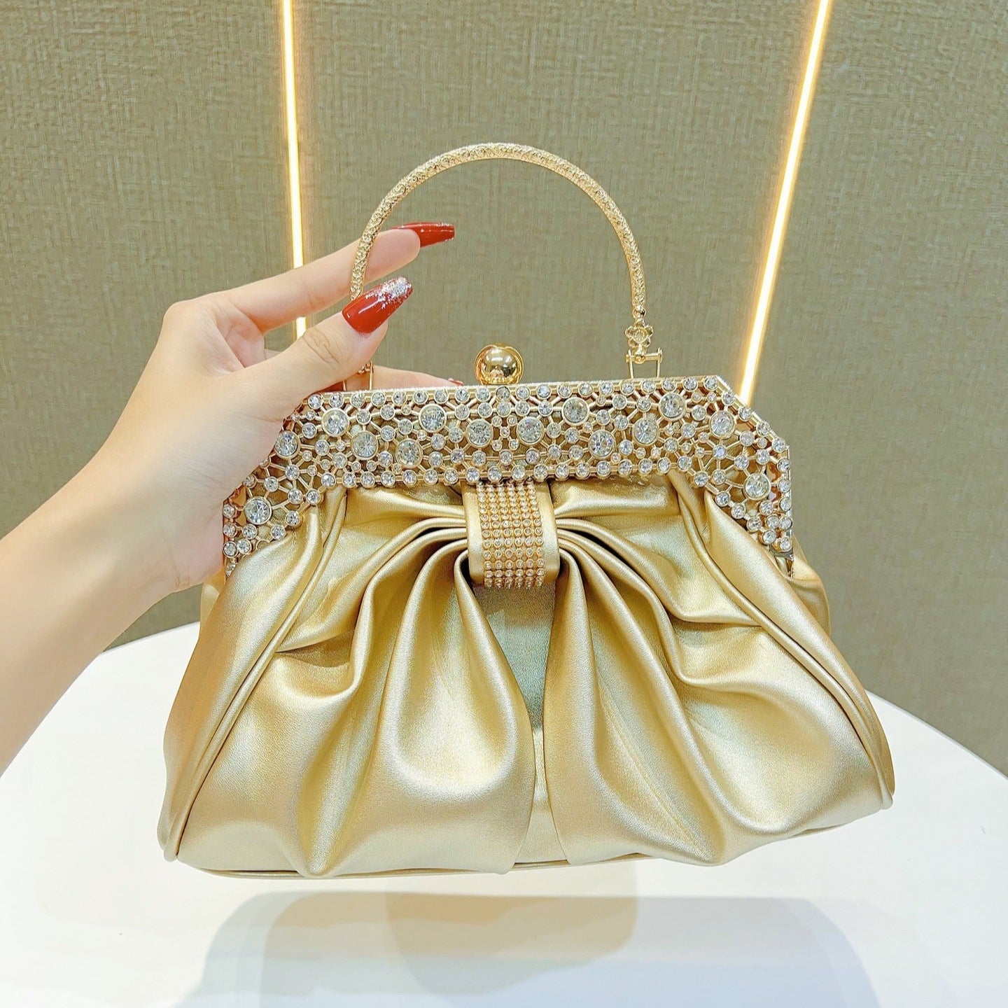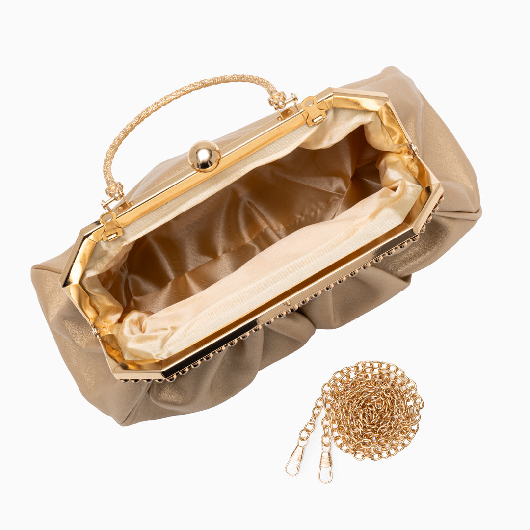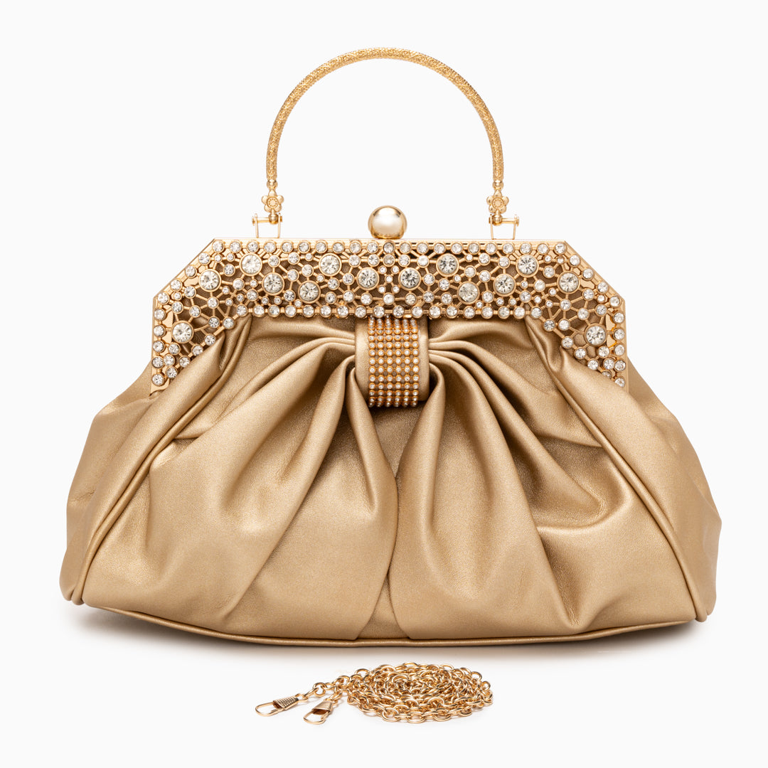 Timeless with a touch of modern drama, the Cagliari Embellished Frame Bag elevates your evening edit with ease. Its softly gathered silhouette is balanced by a sculpted metal frame adorned in delicate florals and sparkling crystal accents. The gold finish adds a refined contrast, while the rhinestone-encrusted top lends vintage charm. Whether held by hand or styled with a chain, this piece delivers statement style in every setting. Ideal for soirées, formal dinners, or unforgettable nights out.