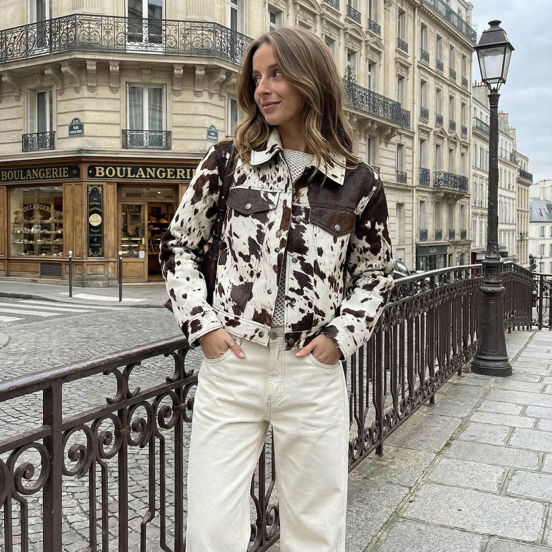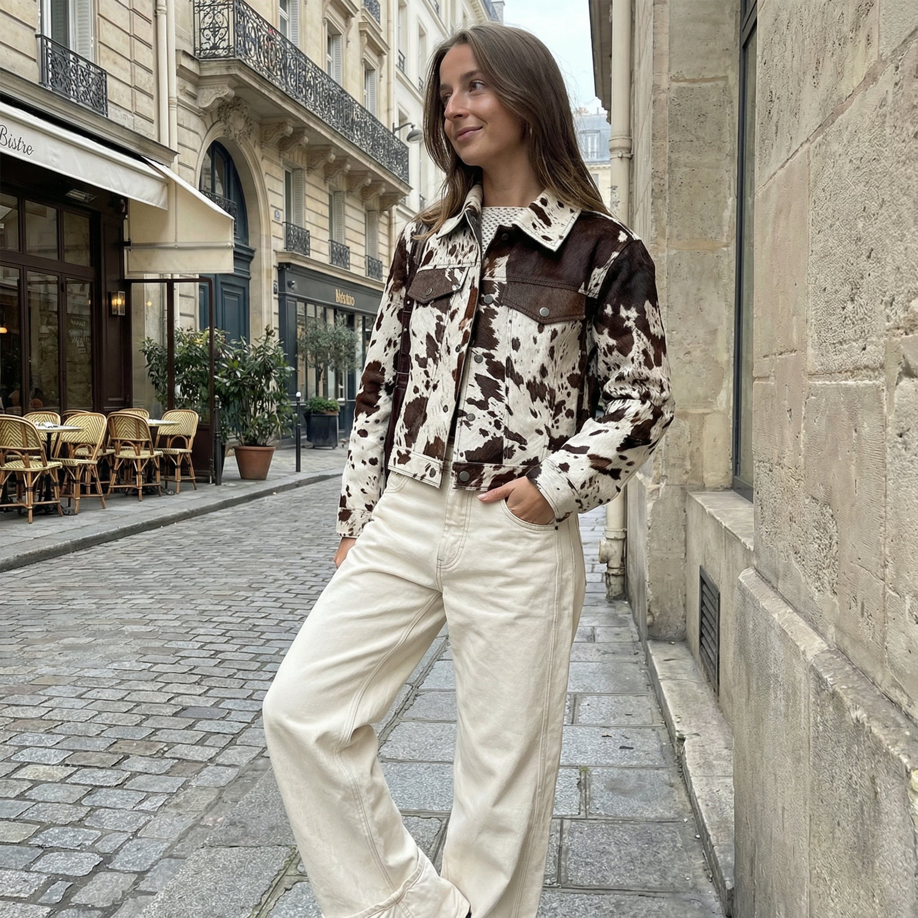 Bold and rustic, the Dakota Cowhide Jacket features a striking cowhide print, structured collar, and classic button-down front. Its textured finish and rich tones give a vintage-inspired edge with modern appeal.