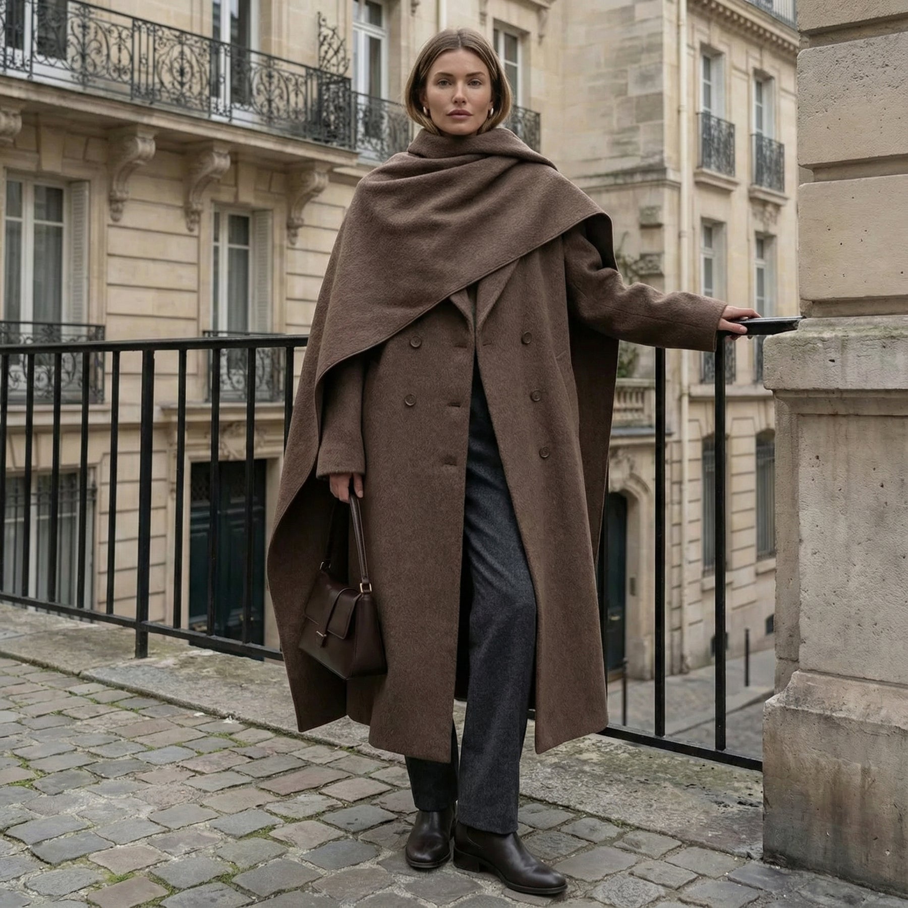 Elevate your winter wardrobe with this drape shawl coat, featuring a sweeping draped detail and classic double-breasted front. Its couture-inspired silhouette brings effortless sophistication to everyday dressing.