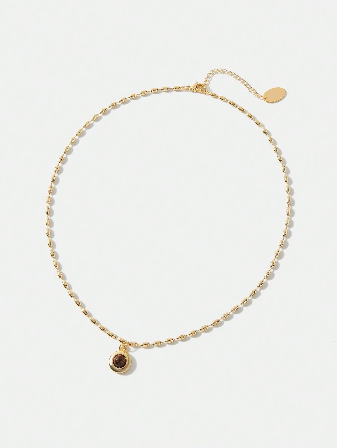 Design: A refined 18K gold plated rice bead chain cradles a polished tiger eye focal, marrying geometric simplicity with warm, sun-kissed hues. The streamlined silhouette and subtle faceting create a modern, versatile piece that layers beautifully or stands alone as a statement of understated luxury.