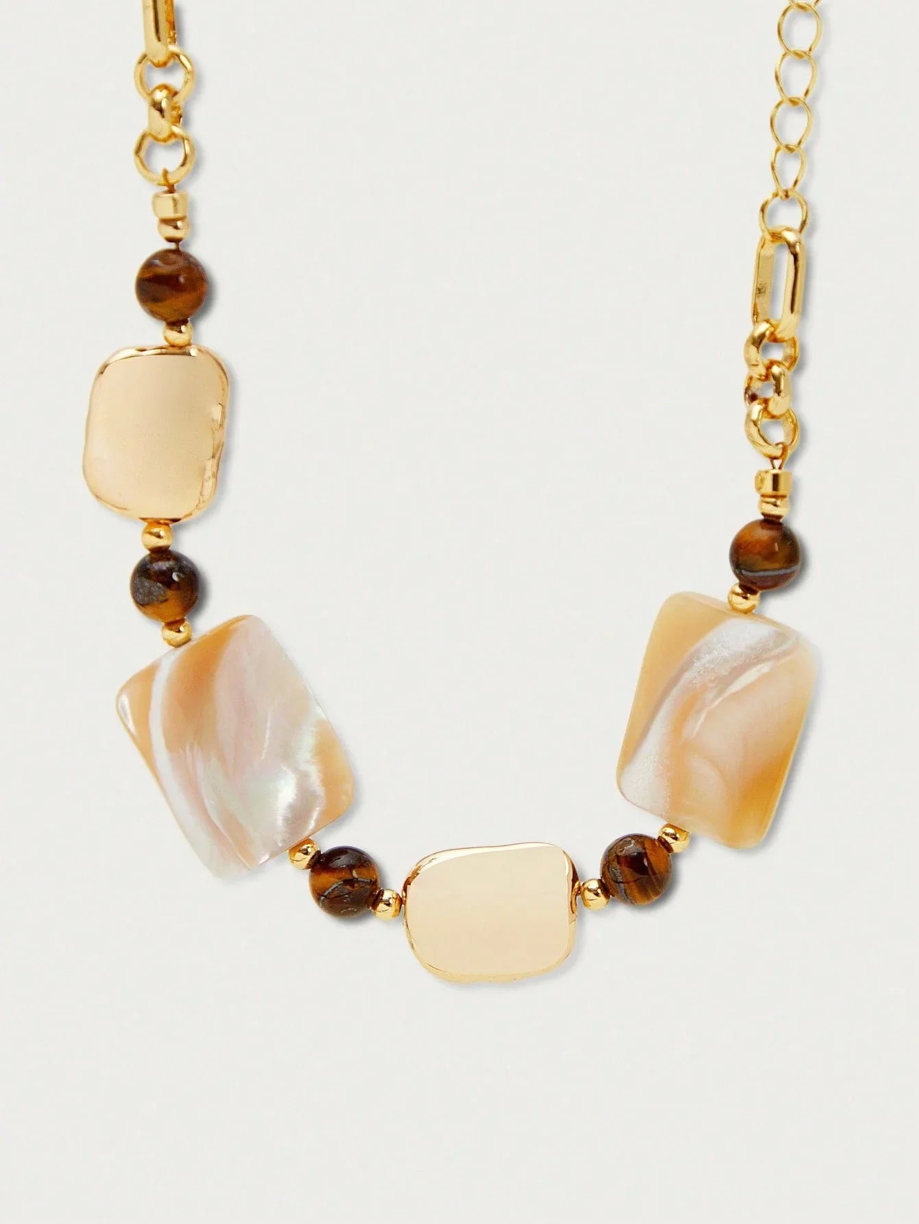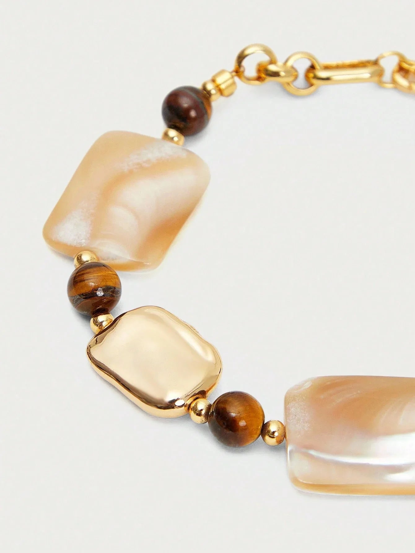 Material: Rendered in 18K gold-plated copper with genuine seashell pearl slices and amber-hued beads, this bracelet offers a luminous, warm finish. The lightweight construction feels comfortable for all-day wear while the plated surface delivers lasting shine and a soft, tactile quality.