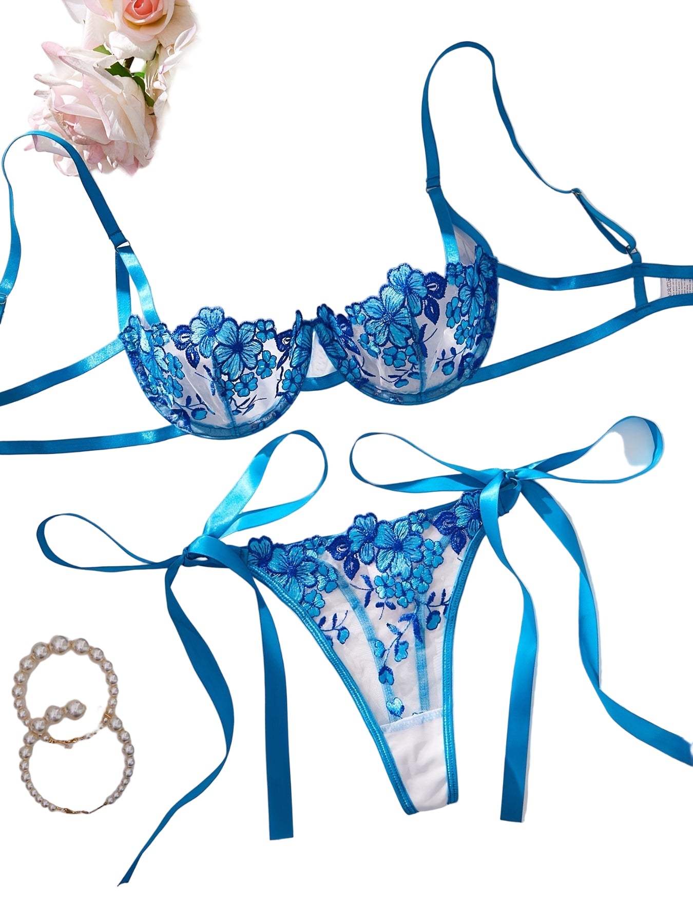 Delight in Elegance with the Aeloria Flower Embroidered Tie-Up Lingerie Set