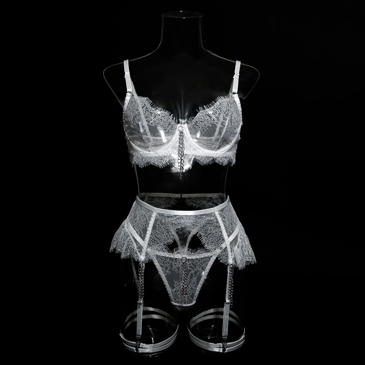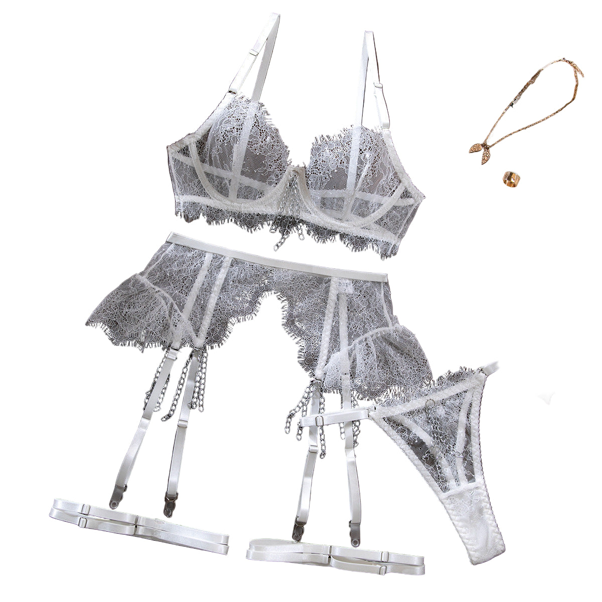 This stunning 5-piece set features intricate lace detailing, a ruffled garter belt, matching thong, and coordinating thigh garters. Delicate little chain accents add just the right touch of daring, exuding a “naughty-but-nice” allure in the most sophisticated way. Perfect as boudoir lingerie or an elegant choice for your wedding night, this set whispers delicate while burning with a fiery edge - making you feel irresistibly seductive and unapologetically confident.