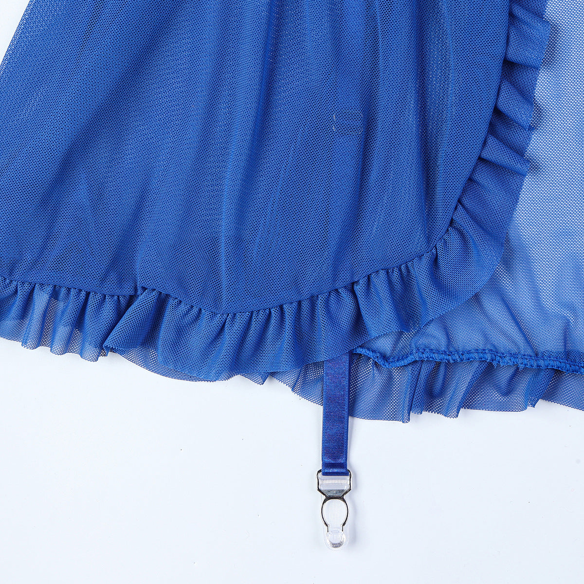 Wrap yourself in pure softness with this dreamy lingerie set, crafted from buttery-smooth fabric that glides over your skin. The set features a delicate bustier adorned with romantic floral accents, offering a flattering silhouette with a touch of vintage charm. A flirty, ruffled mini skirt adds playful movement, while coordinating fishnet stockings bring a sultry edge to the ensemble. Perfect for when you want to feel feminine, confident, and irresistibly chic.