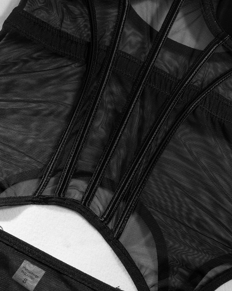 Sexy Mesh Breathable Body Shaping Split Steel Ring Gathered with Leg Ring Suit