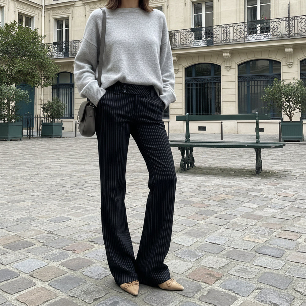Low-Rise Flared Trousers - Black Striped