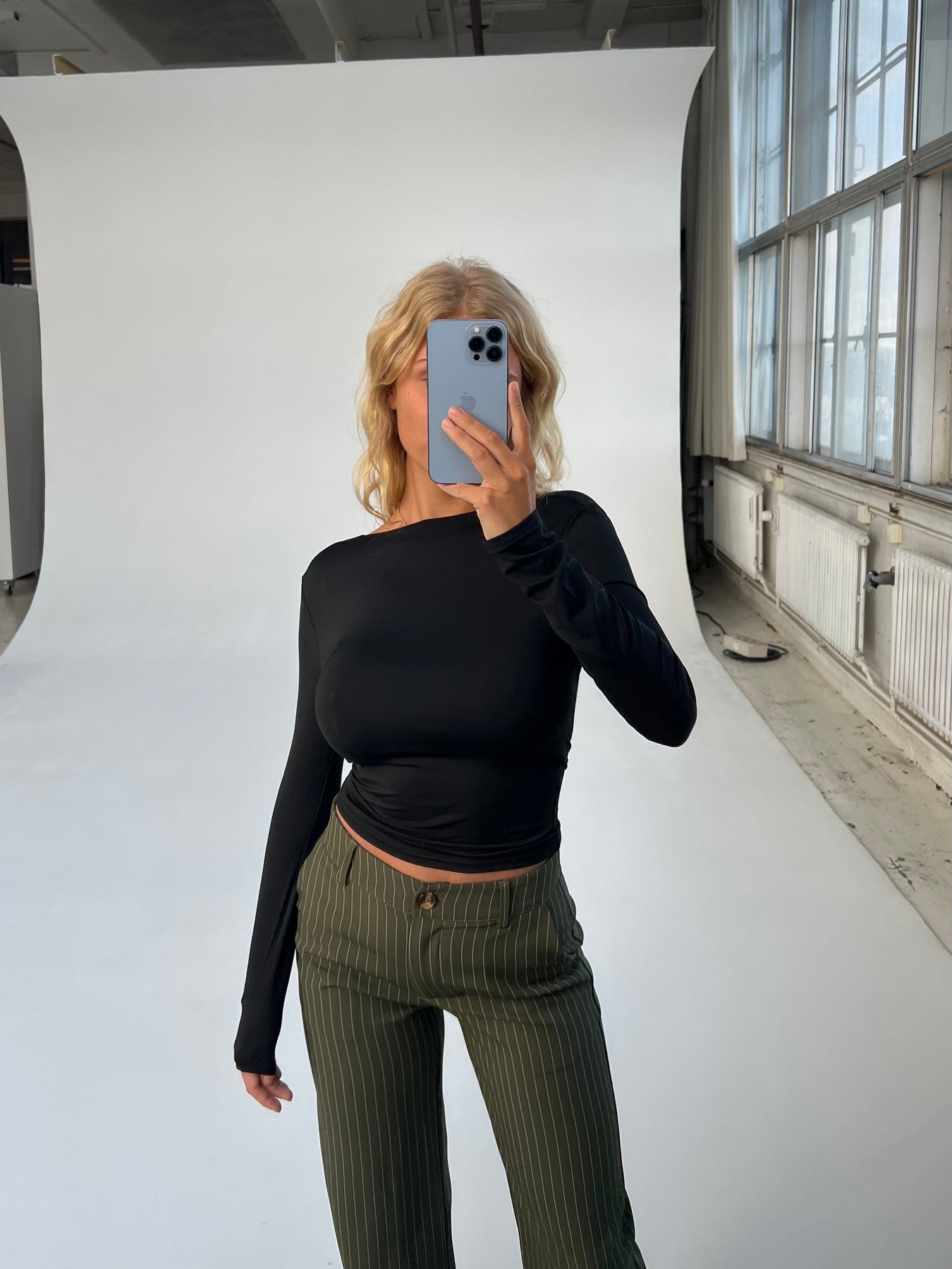 The model is approx. 168 cm and wears an XS. The trousers are regular in size.