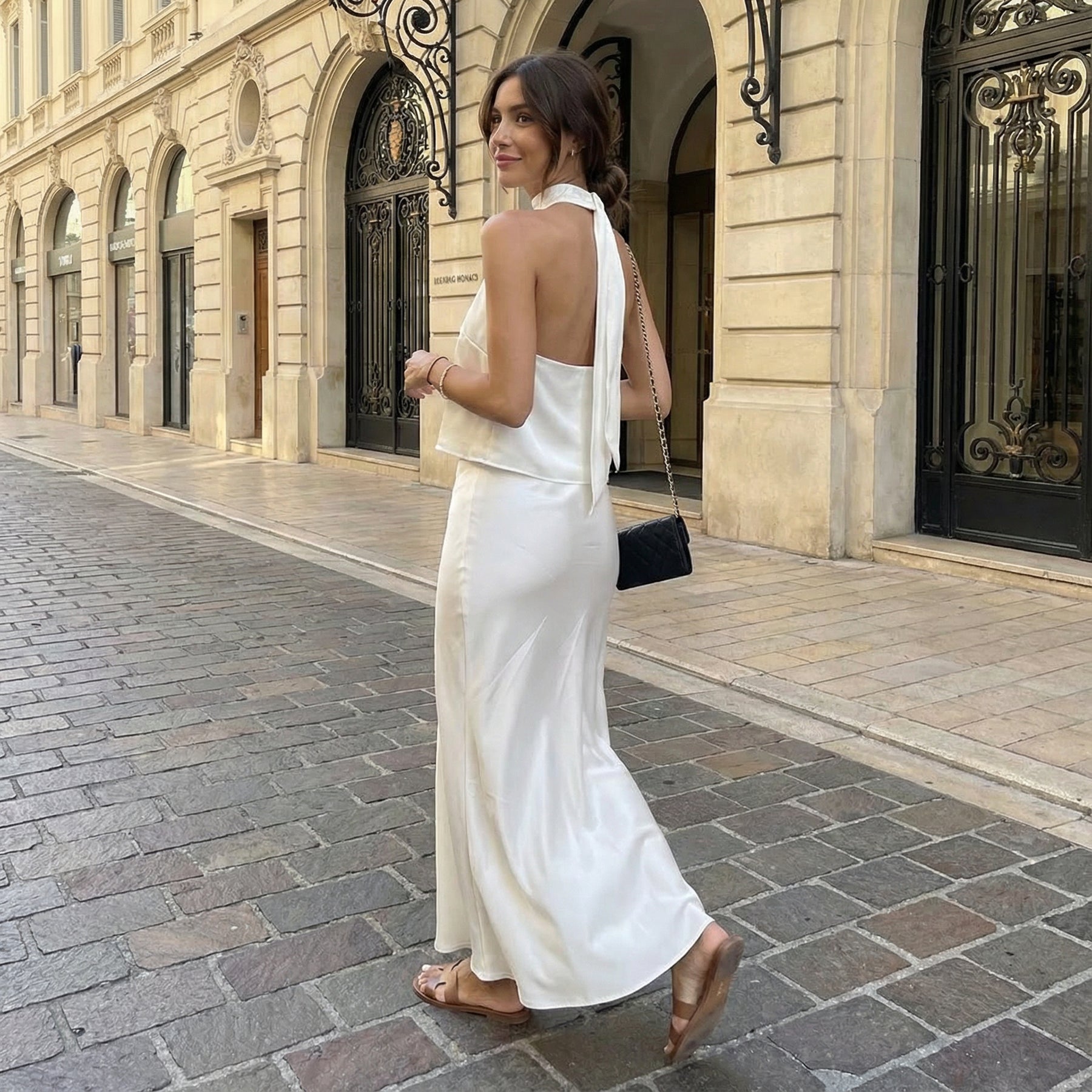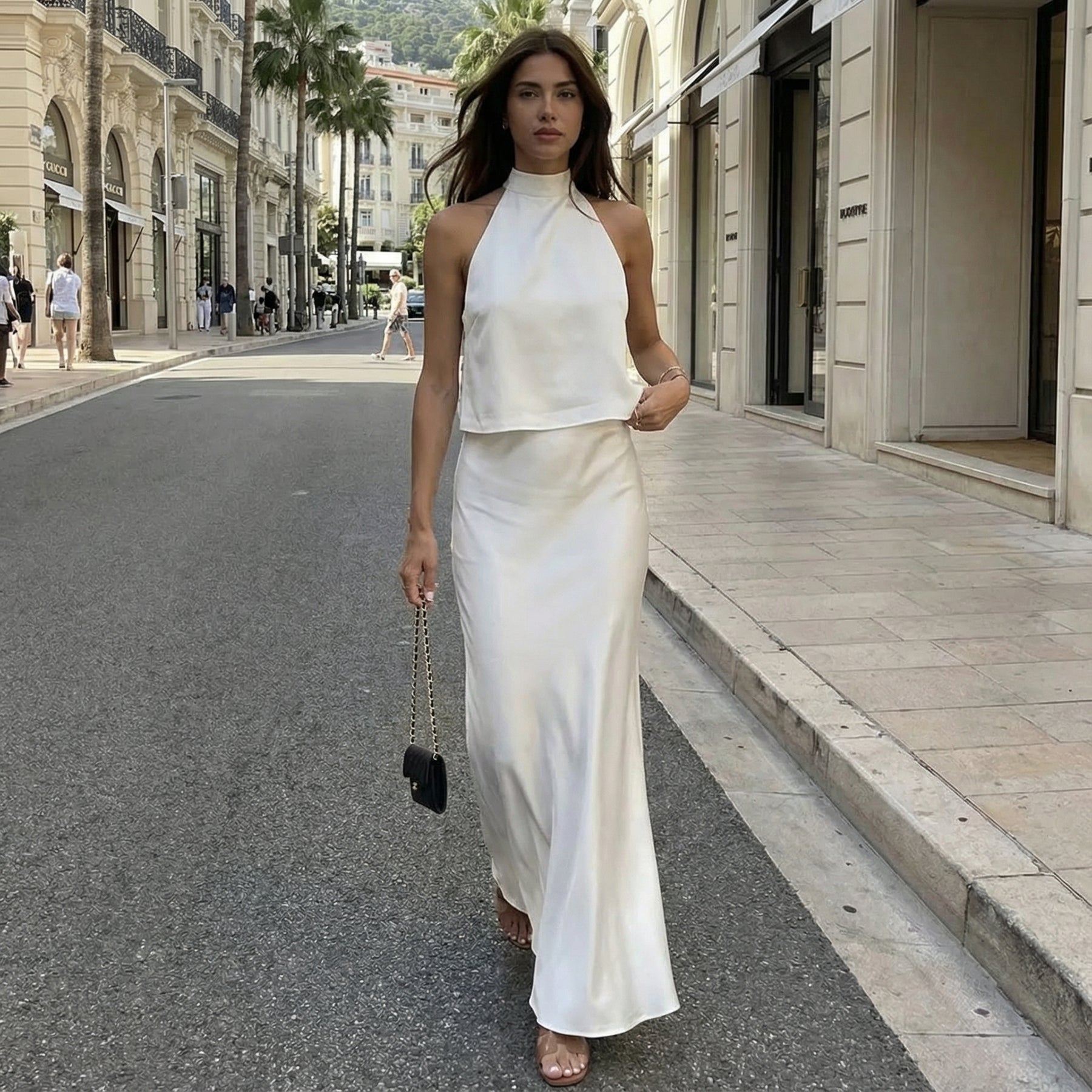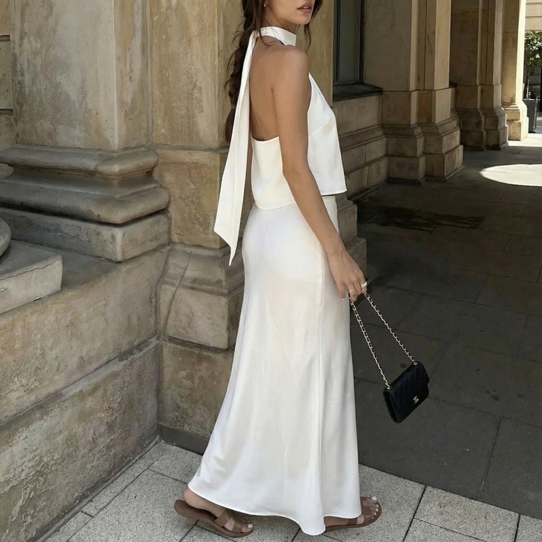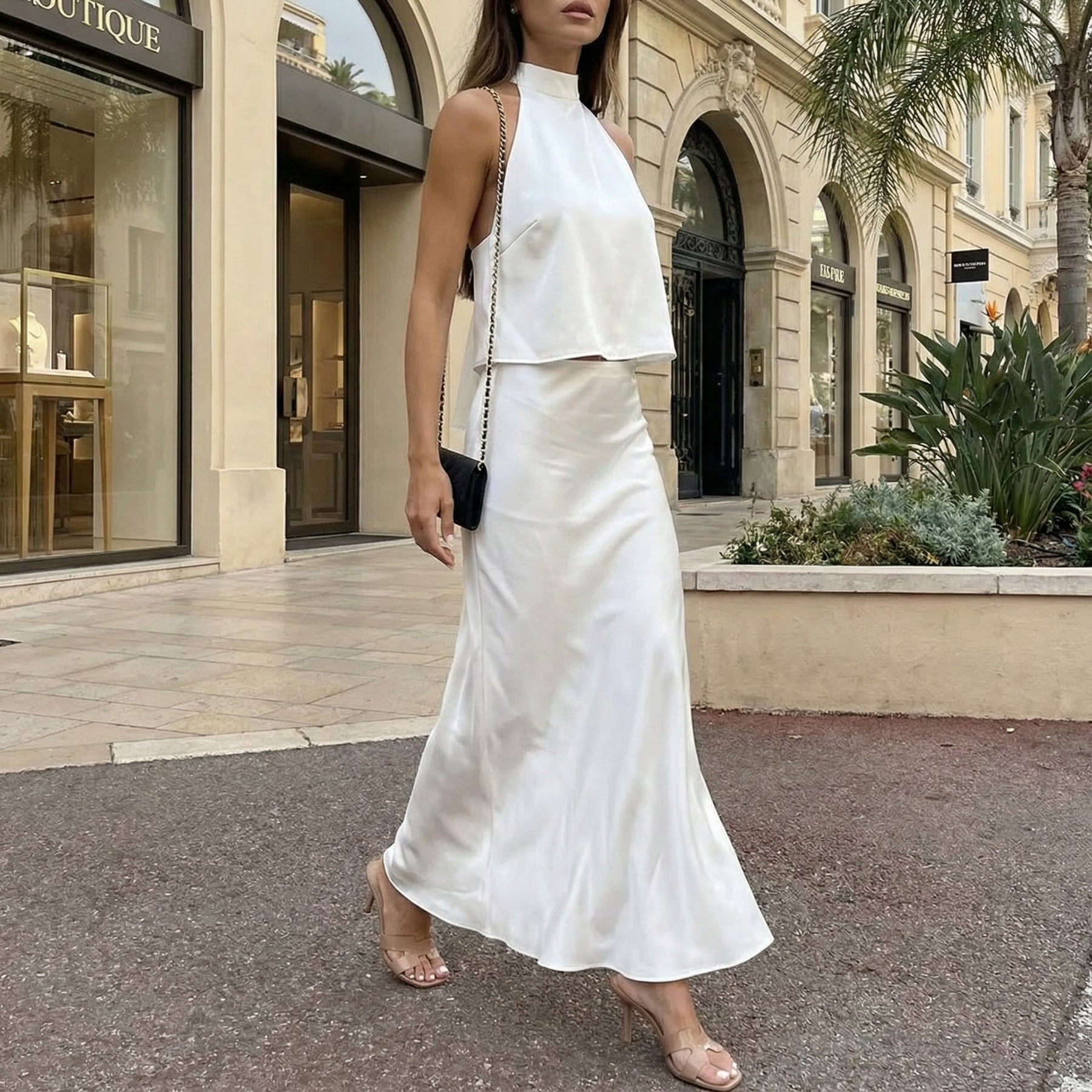 Exude effortless sophistication with this open-back satin crop top and maxi skirt set. The sleek satin crop top features a striking open-back design, paired with a flowing high-waisted maxi skirt that moves gracefully with every step. Crafted from lightweight fabric, the set offers a polished, fluid silhouette ideal for elevated summer styling.