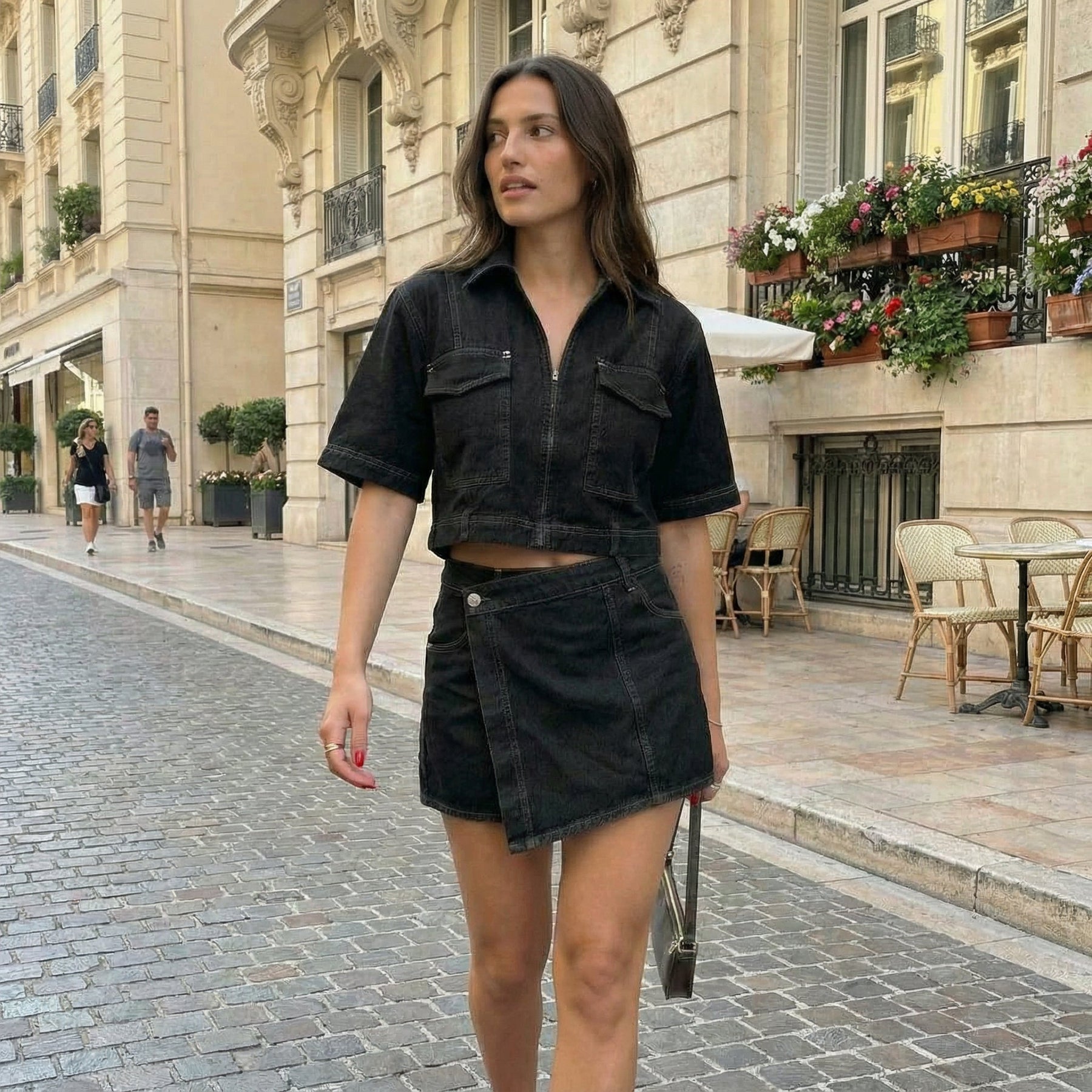 Achieve effortless street style with this Jade utility denim set, featuring a structured zip-up crop top with practical pockets and a high-waisted asymmetrical mini skirt. Crisp stitching and a flattering silhouette add an edgy yet versatile touch.