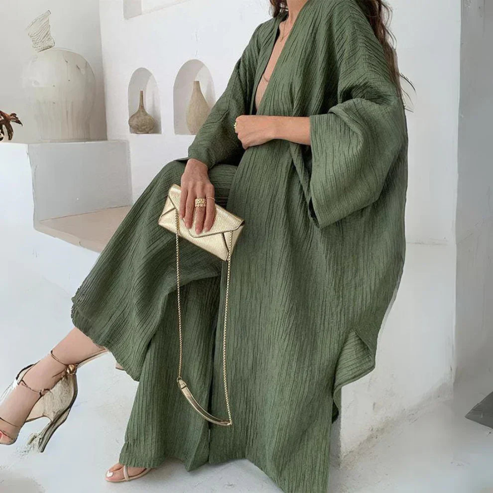 Step into serene style with the Solana Drape Cardigan Set — a lightweight, flowy duo made for days when comfort and elegance go hand in hand. Featuring wide-leg textured pants and a relaxed longline cardigan with fluid sleeves, this set is effortlessly polished yet completely wearable.