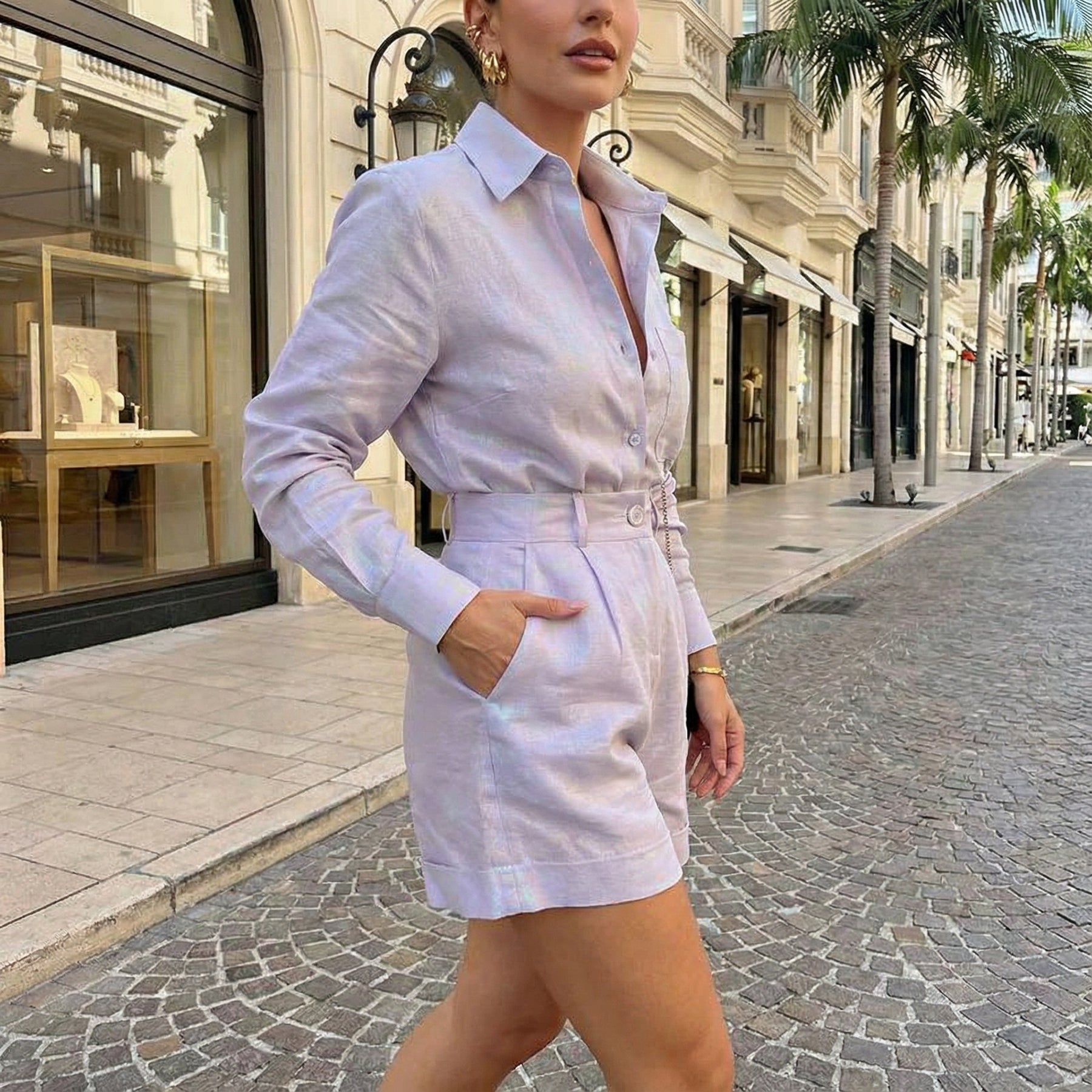 Stay effortlessly chic with this button-up shirt and high-waisted shorts summer set. The relaxed-fit shirt features a structured collar and breezy silhouette, paired with tailored shorts that create a balanced, polished look. Crafted from lightweight spandex, the set ensures all-day comfort and breathability.