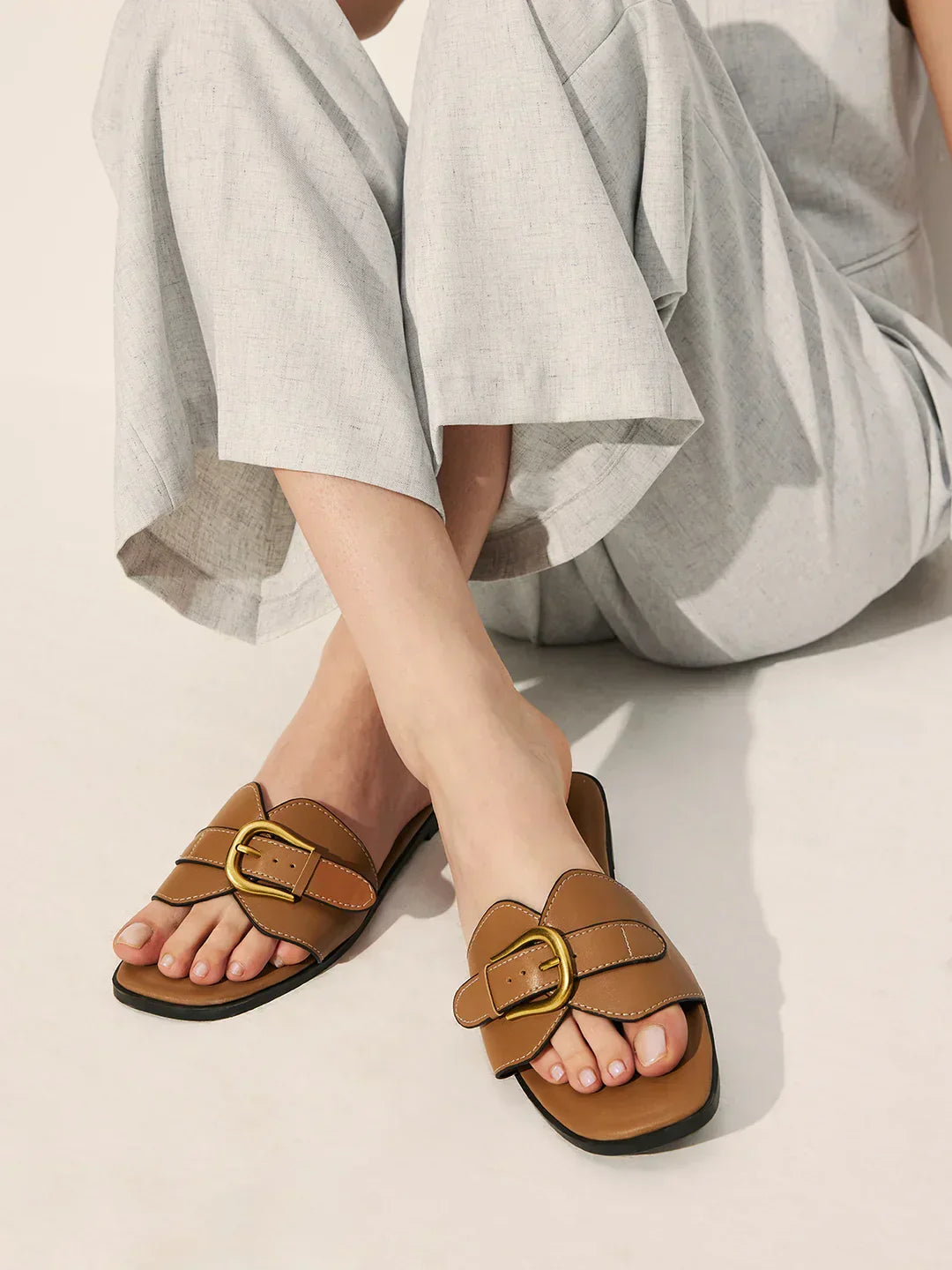 Design: French-inspired flat slippers with a retro buckle detail, offering a laid-back yet chic silhouette ideal for effortless summer styling.