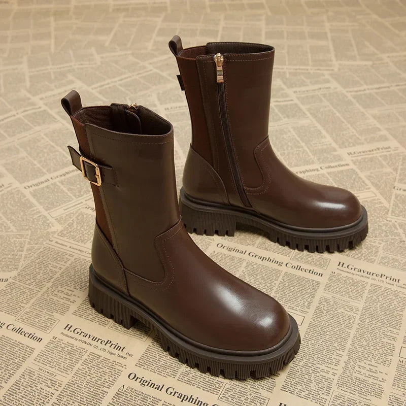 Tough, sleek, and built to stand out, the Marlow Buckle Combat Boots are your new go-to for effortless edge. Crafted with a smooth faux leather finish, chunky ridged soles, and a bold buckle detail at the ankle, these boots fuse rugged style with a polished feel. The side zip makes slipping them on a breeze without sacrificing the clean silhouette.