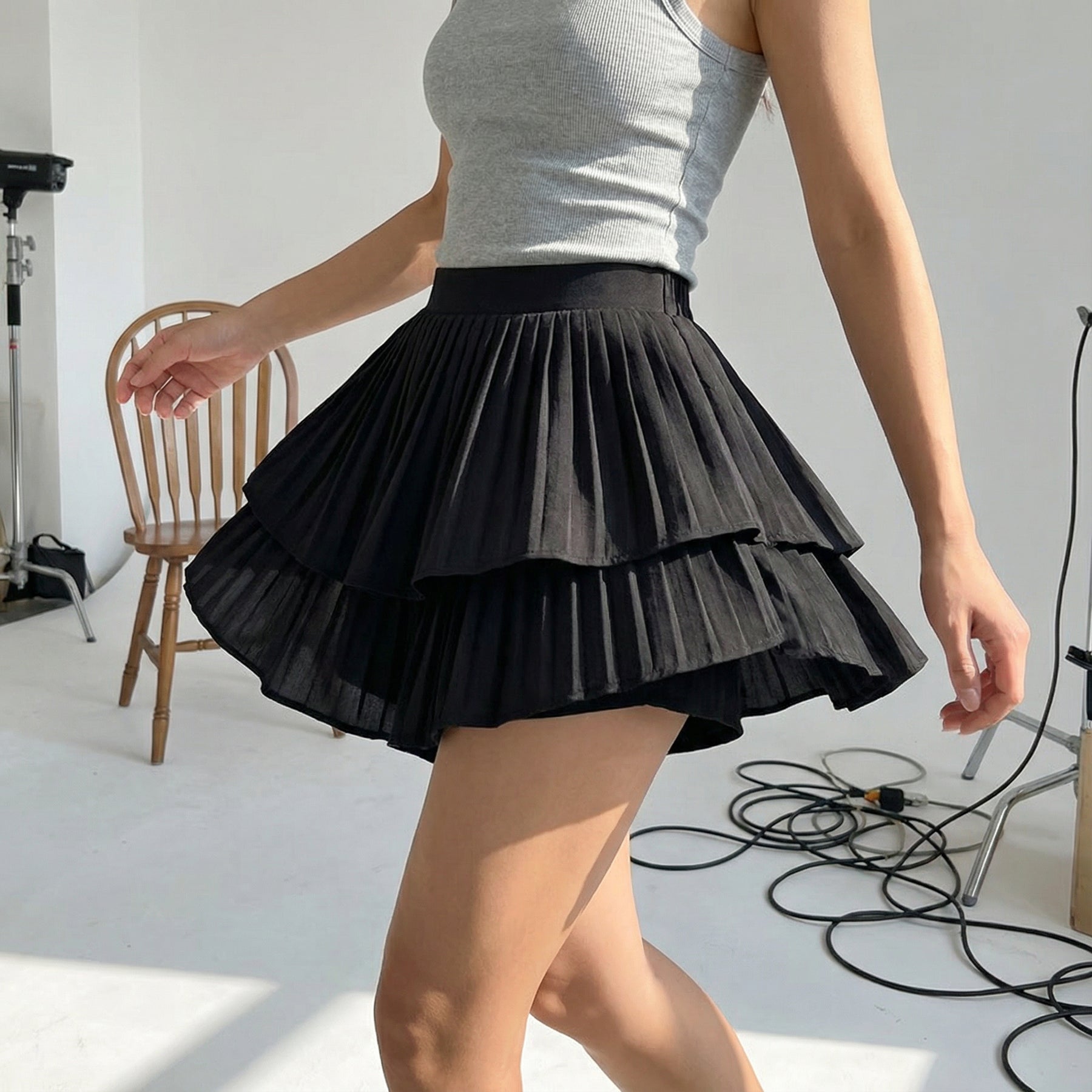 Experience the perfect blend of style and comfort with this chic and playful garment that combines the look of a mini-skirt with the practicality of shorts. Featuring a high-waisted design and all-over delicate pleating, this skort boasts two tiers of flowy, cascading ruffles for dynamic movement. The soft, inner shorts provide confidence and coverage, making it ideal for both casual outings and active days.