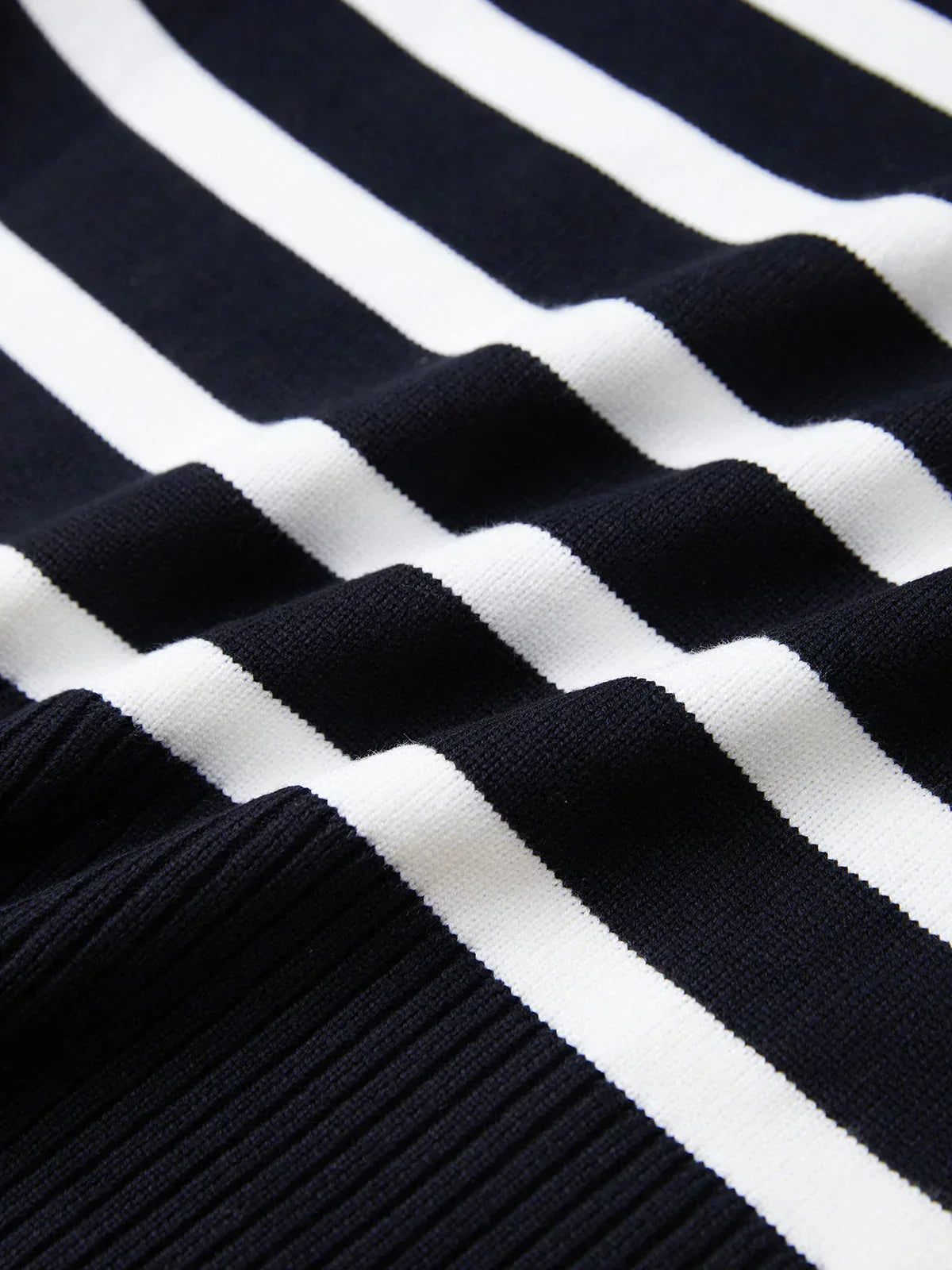 Design: A classic mockneck sweater featuring a timeless striped pattern, a soft knit texture, and a relaxed silhouette. The elevated design blends comfort with effortless style.