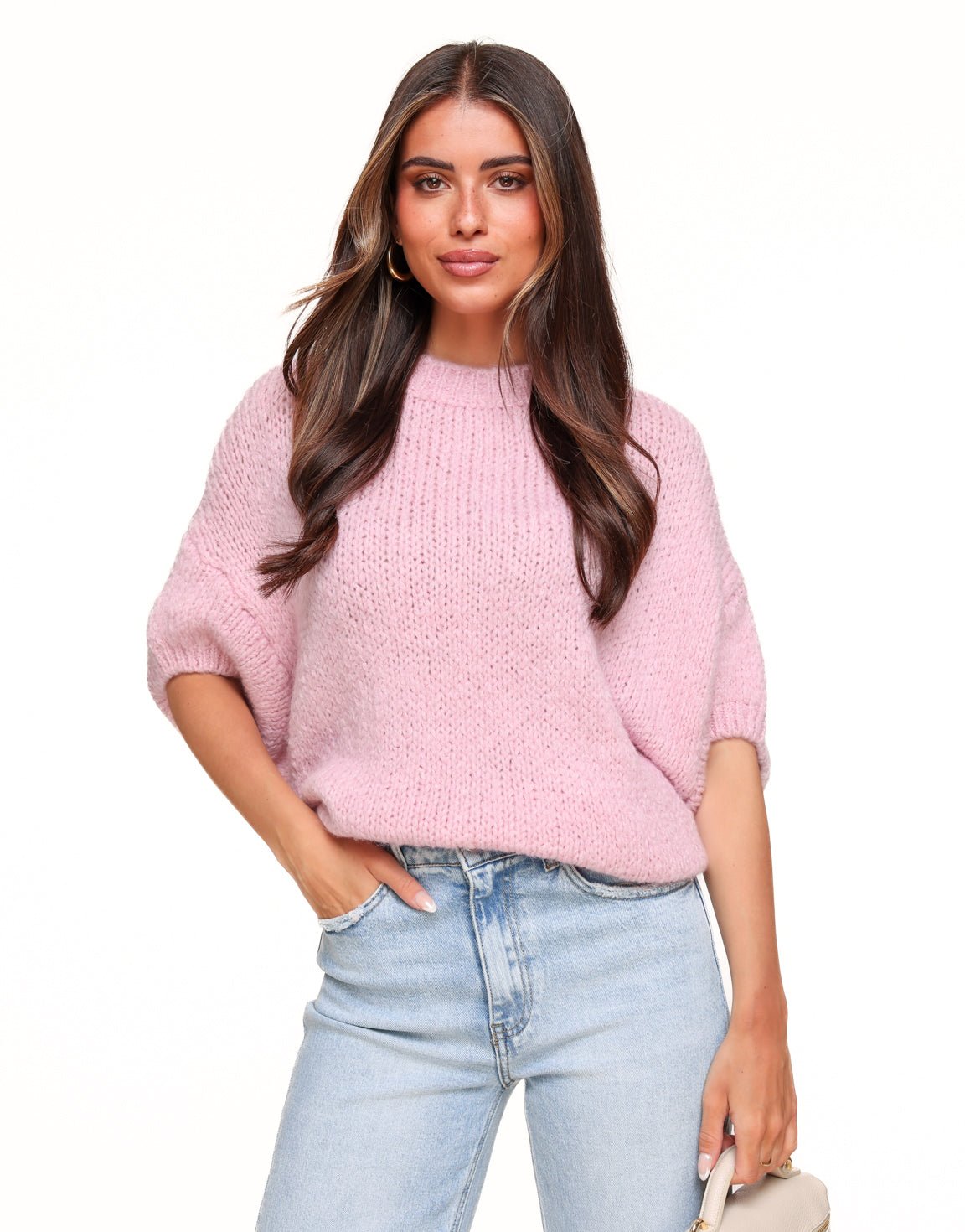 Light Pink Knitted Wool 3/4 Sleeves - Sweater