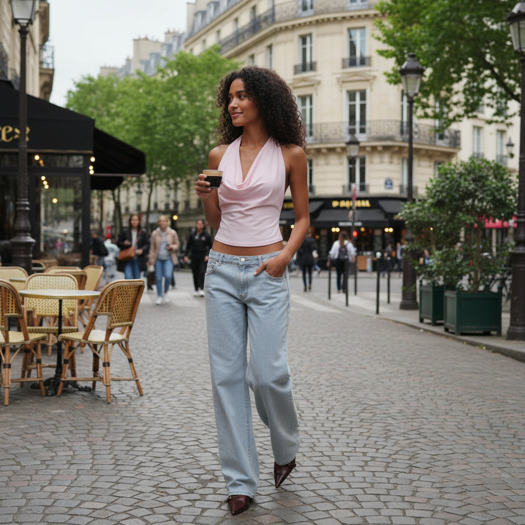 Elegant halterneck top with a beautiful draped neckline that highlights the shoulders and neckline. Made from a smooth satin-like material with a soft sheen and gentle stretch for a flattering fit. The top ties at the neck and fits snugly around the waist, creating a sophisticated silhouette. The fit is true to size. The model is wearing size XS/S.