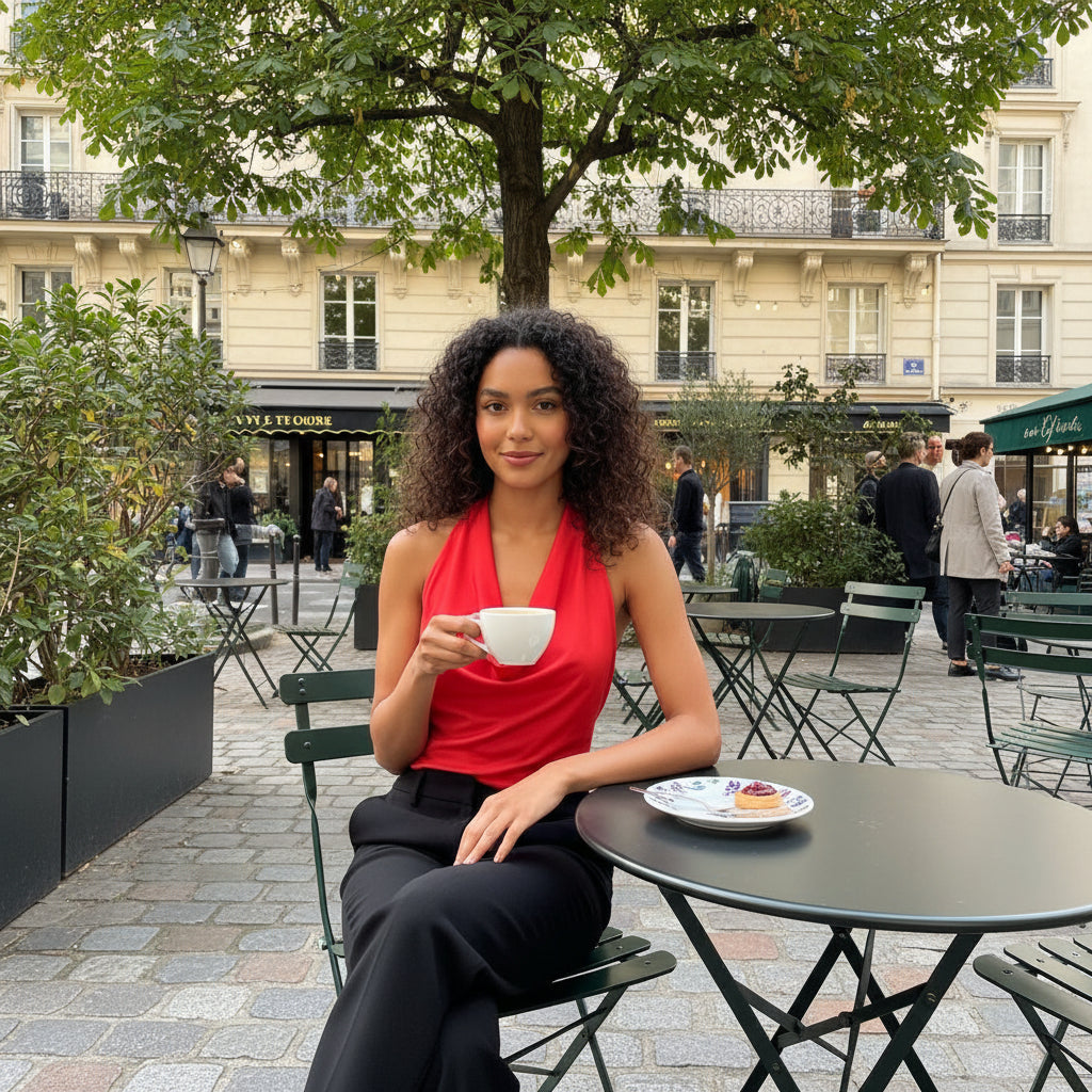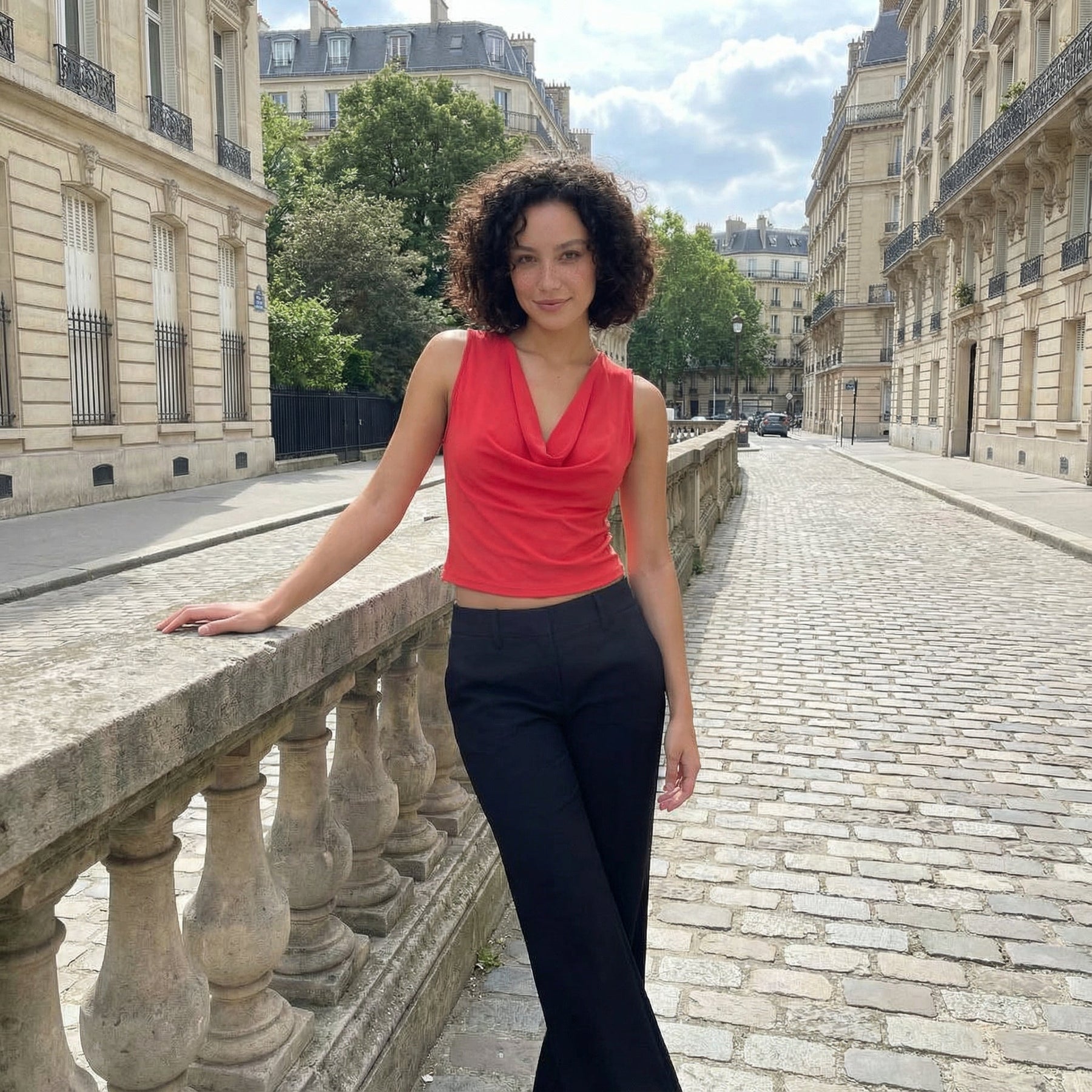 Elegant halterneck top with a beautiful draped neckline that highlights the shoulders and neckline. Made from a smooth satin-like material with a soft sheen and gentle stretch for a flattering fit. The top ties at the neck and fits snugly around the waist, creating a sophisticated silhouette. The fit is true to size. The model is wearing size XS/S.