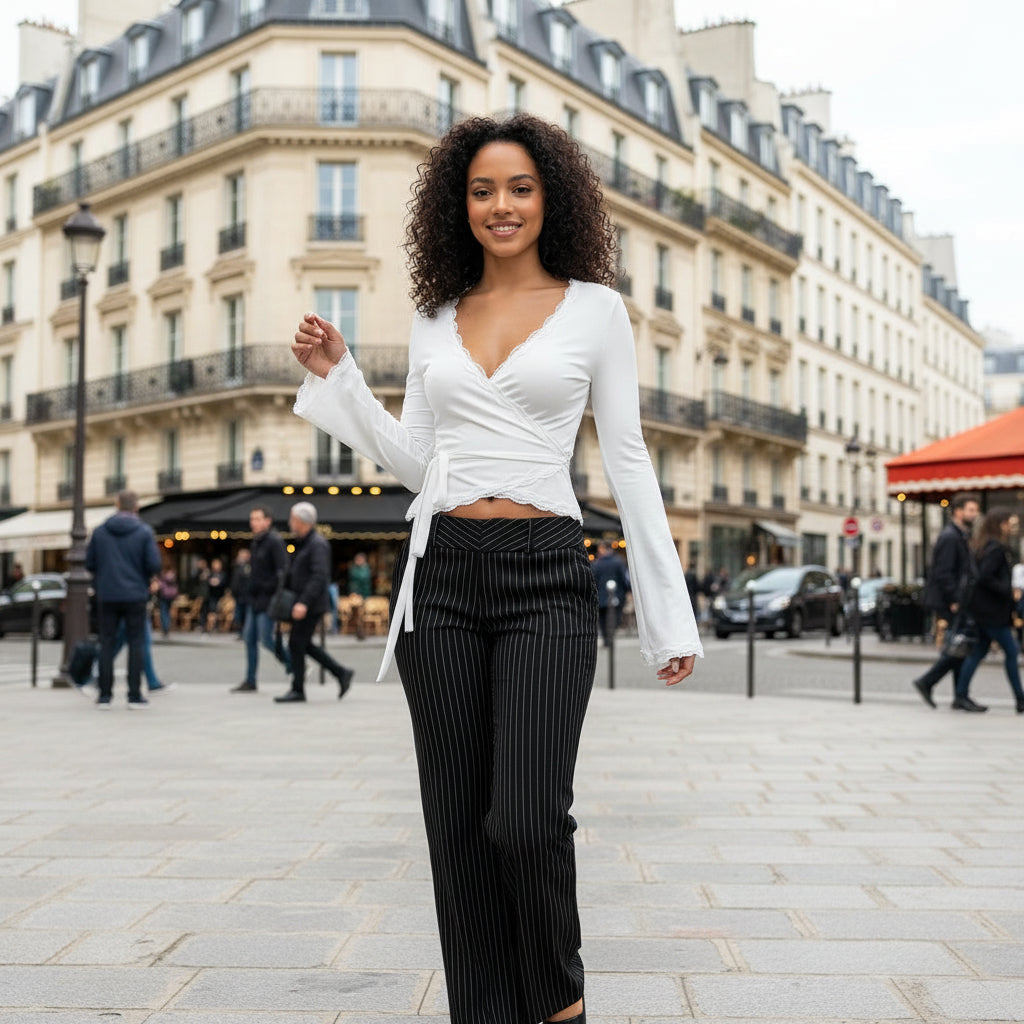 Experience ultimate comfort and style with this soft, stretchy wrap top. Designed to hug the body beautifully, it features long sleeves and a deep neckline for a sophisticated look. Perfect for both casual days and dressy occasions. Regular fit; model wears XS/S.