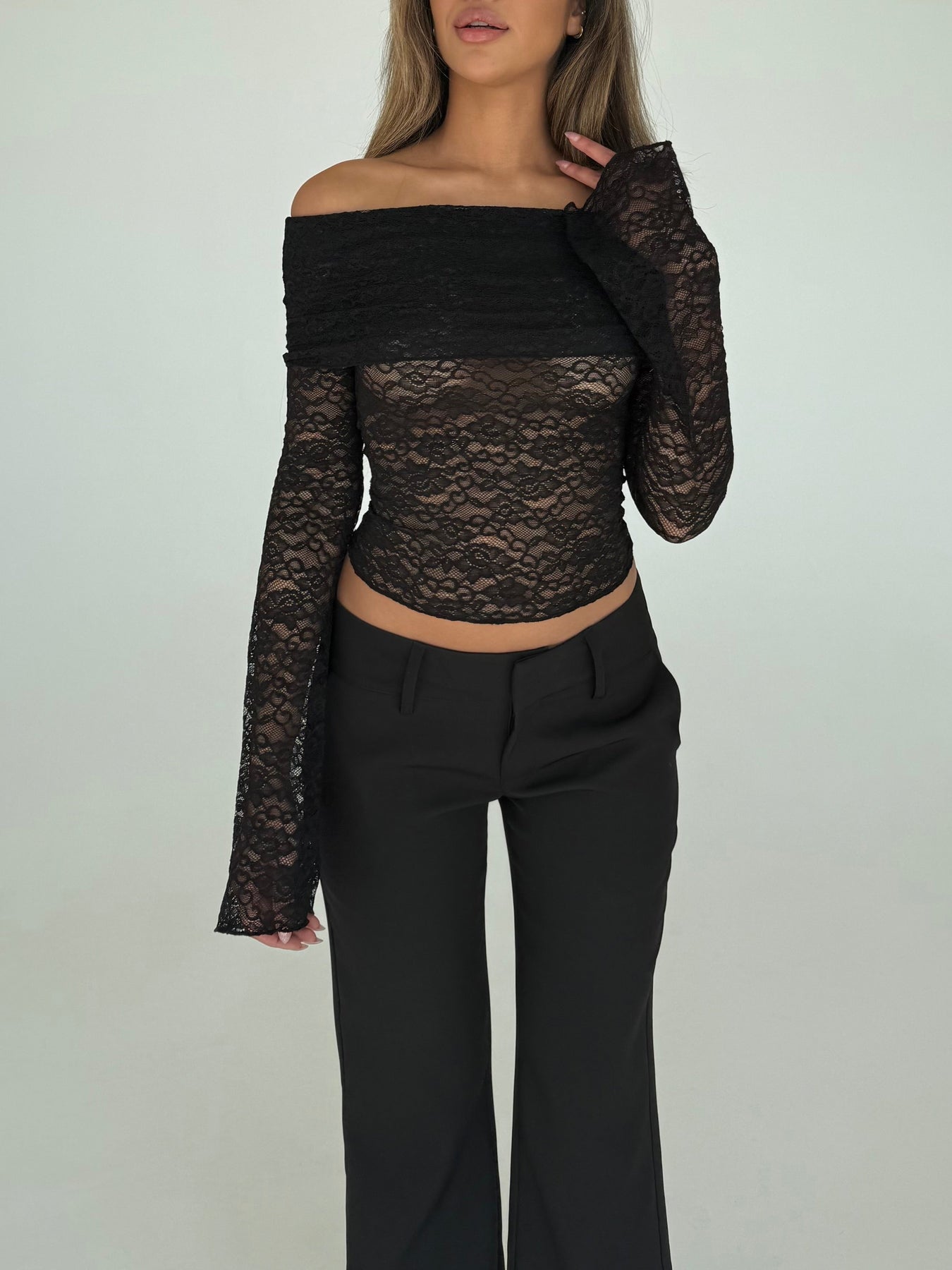 Off-shoulder top in the softest lace material. The top fits beautifully to the body and features long sleeves.