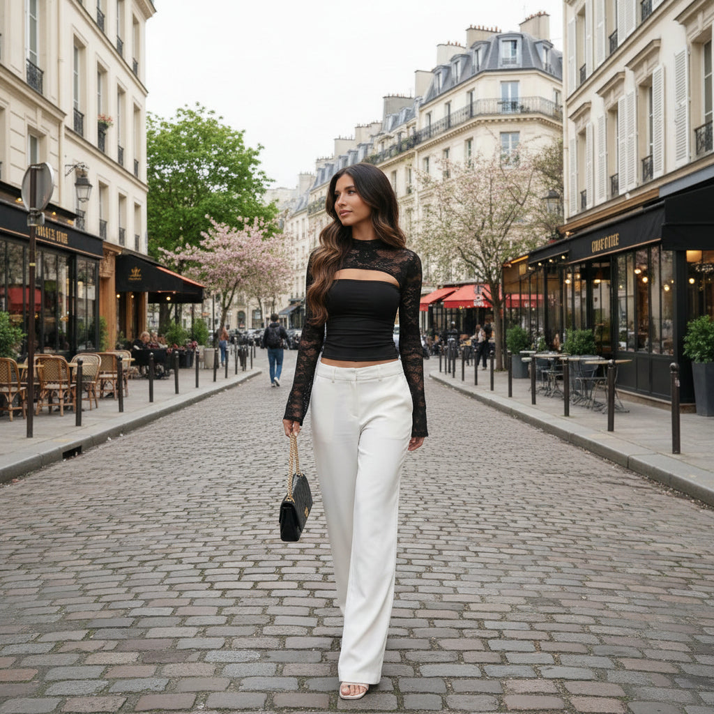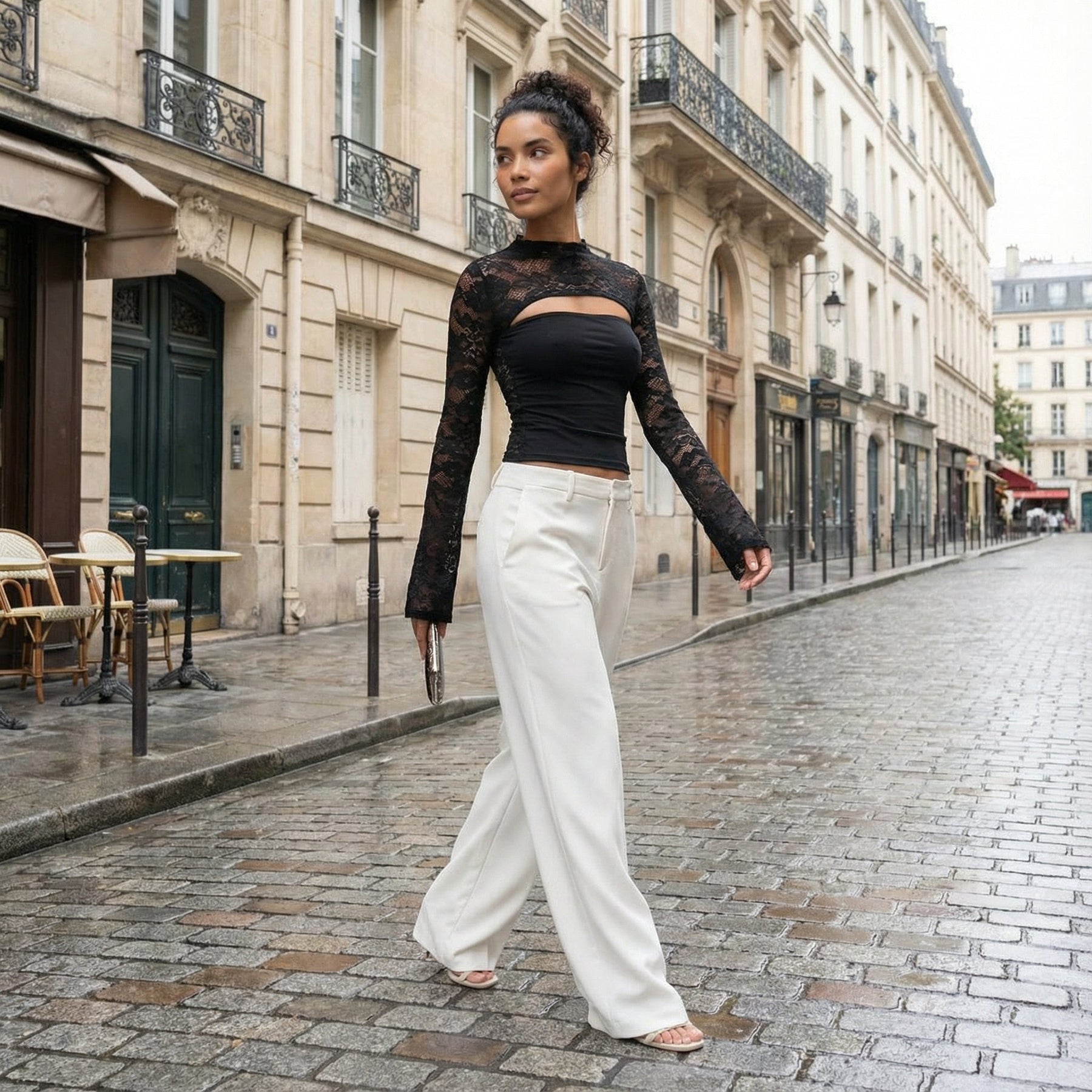 This elegant lace top is crafted from a soft, stretchy material that flatters the body beautifully. Featuring long sleeves with lace detailing on the upper section and a fully lace back, it adds a touch of sophistication to any outfit. The fabric may be slightly sheer, so we recommend wearing nipple covers underneath — as styled by the model. Standard fit; model wears XS/S.