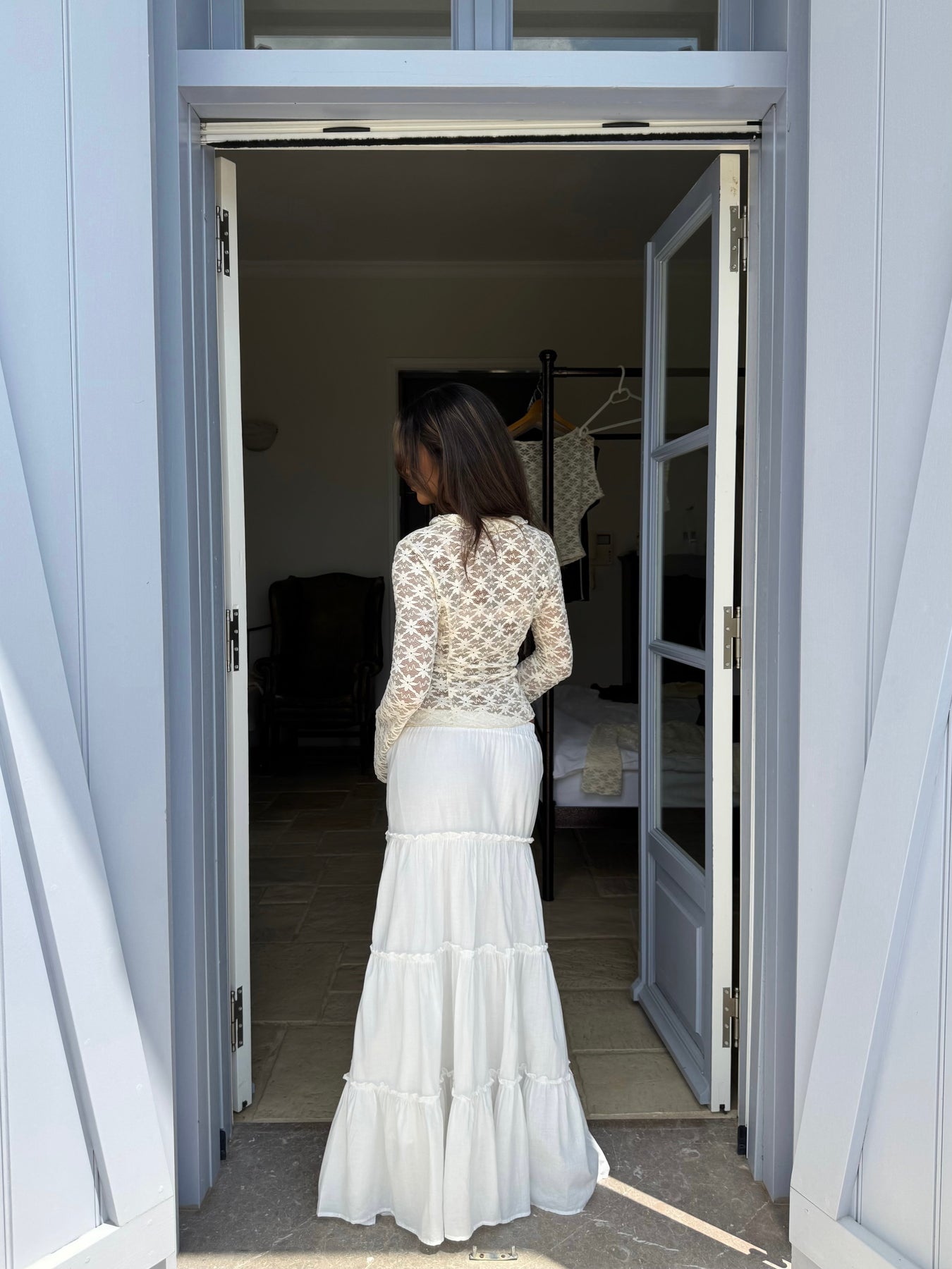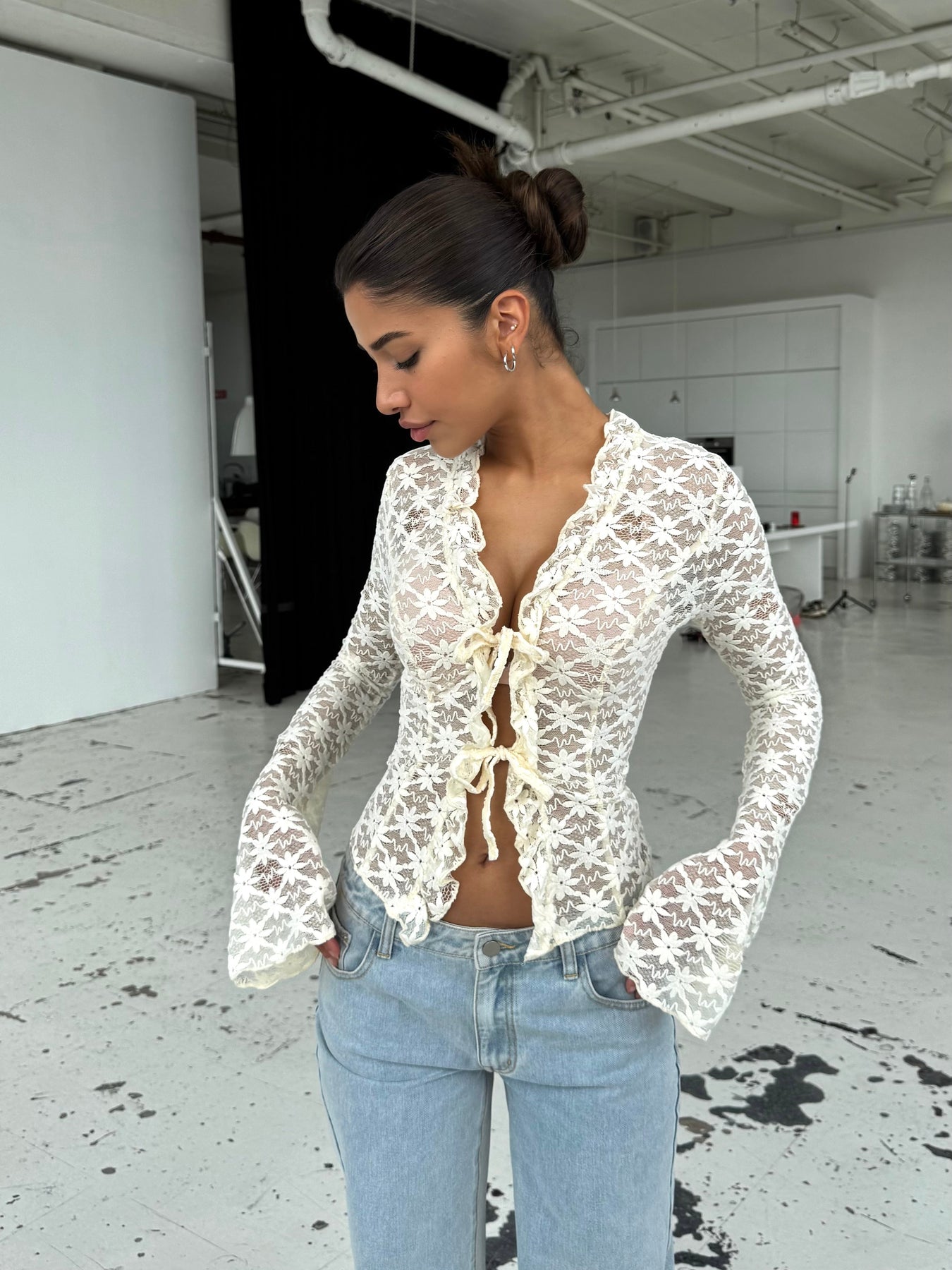 Beautiful lace top with tie closure and long sleeves. The top is made of a soft lace fabric that is very comfortable to wear. It ties in two places and can therefore be adjusted to fit as desired.