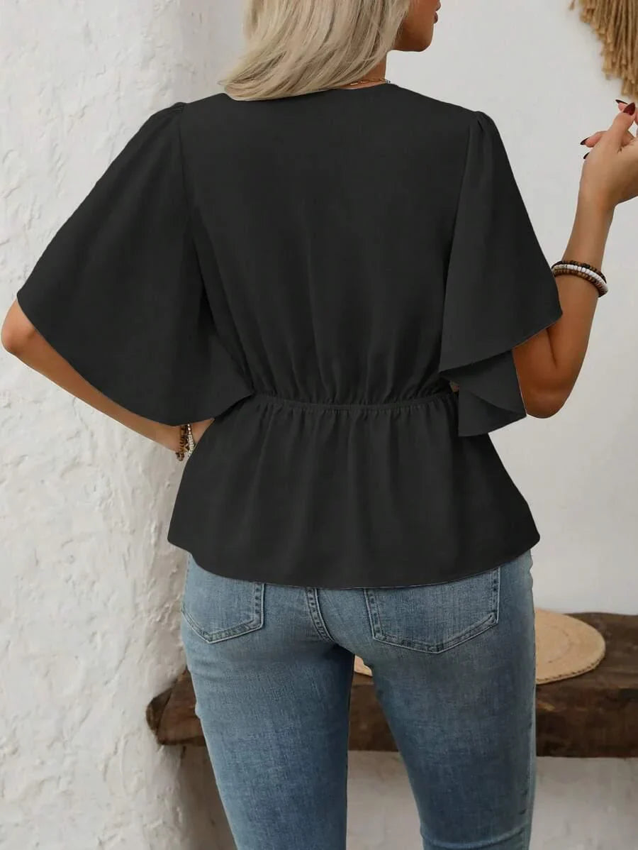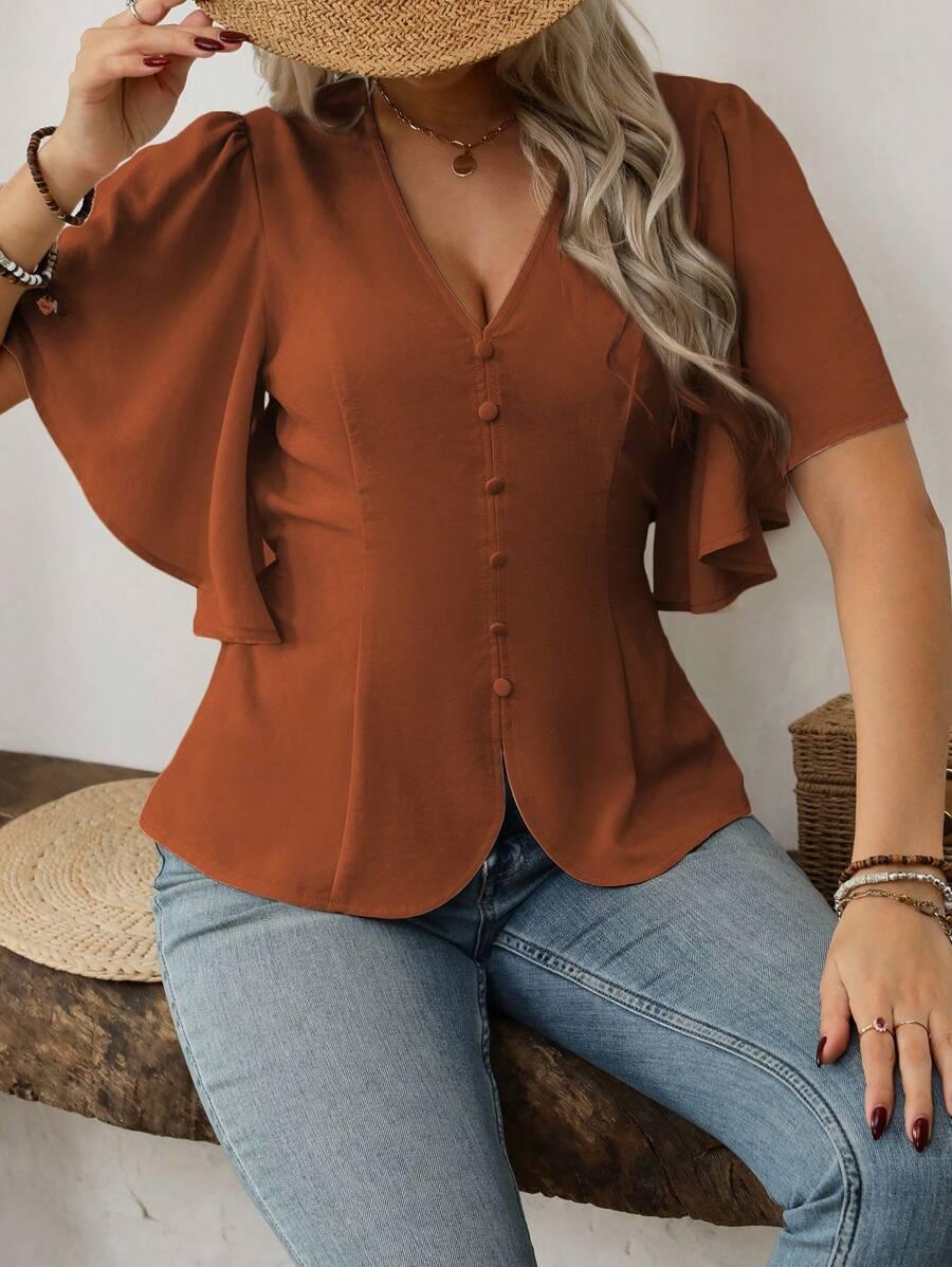 Plus Size Elegant V Neck Button Front Blouse Flared Sleeves