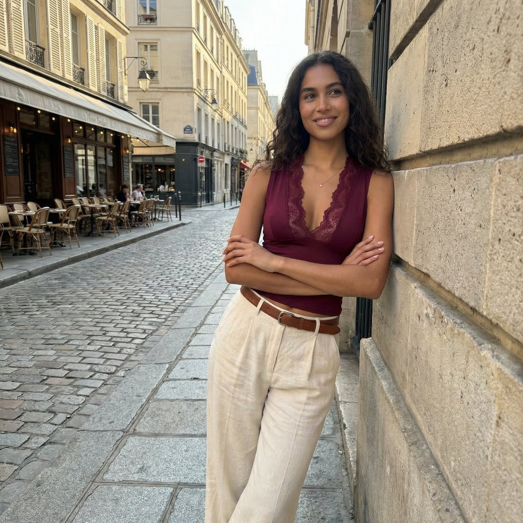 This beautifully soft tee is made from a stretchy, comfortable fabric that flatters the body perfectly. Delicate lace detailing along the edges adds a feminine and elegant touch. True-to-size fit; model wears XS/S.