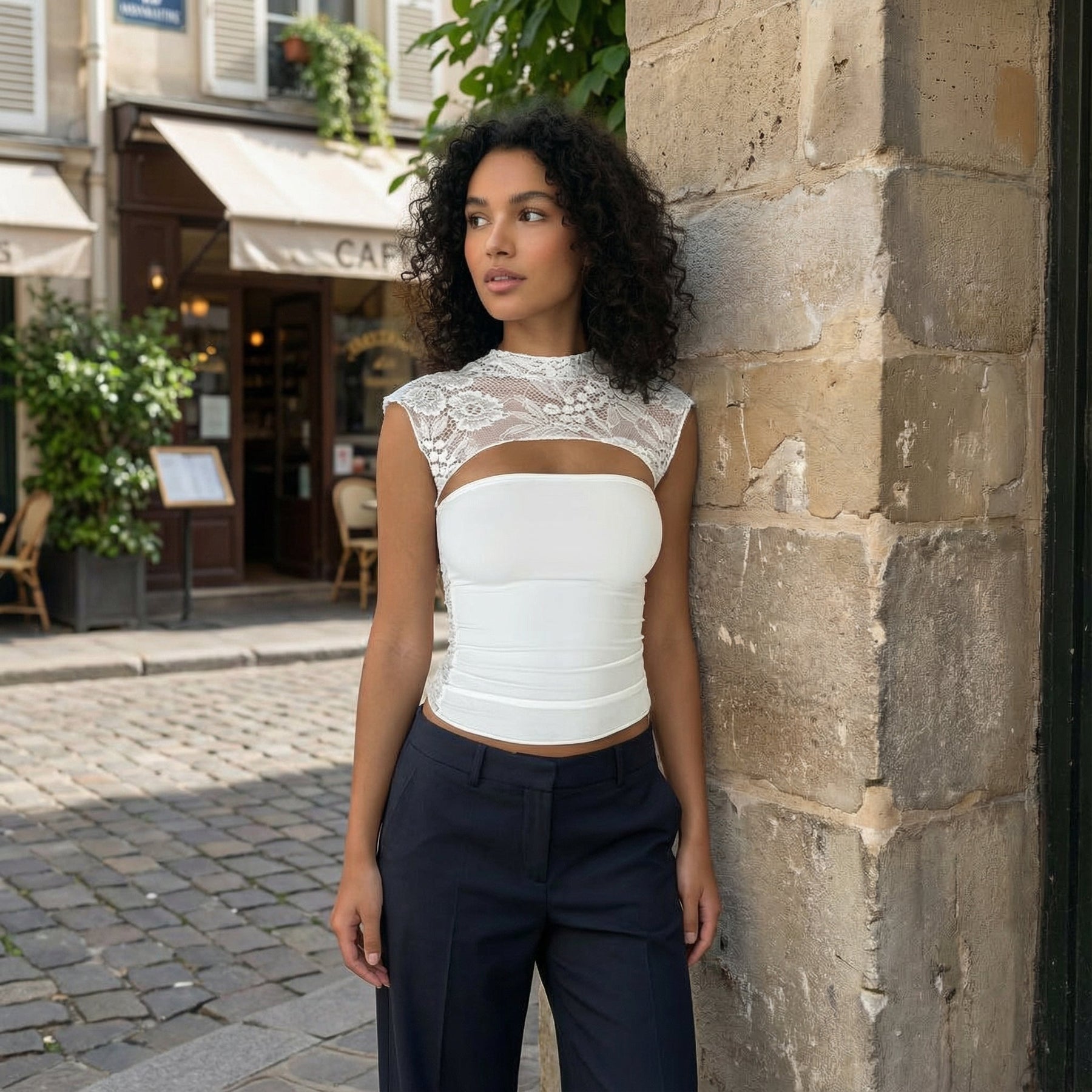 This sleeveless lace top is crafted from a soft, ultra-stretchy fabric that flatters the body perfectly. Featuring delicate lace across the chest and a fully lace back, it exudes elegance and femininity. The material may be slightly sheer, so we recommend pairing it with our nipple covers, as worn by the model. Regular fit; model wears XS/S.Beautiful lace top made from material with plenty of stretch, fitting beautifully to the body. The top has lace detailing at the top and covers the entire back.
