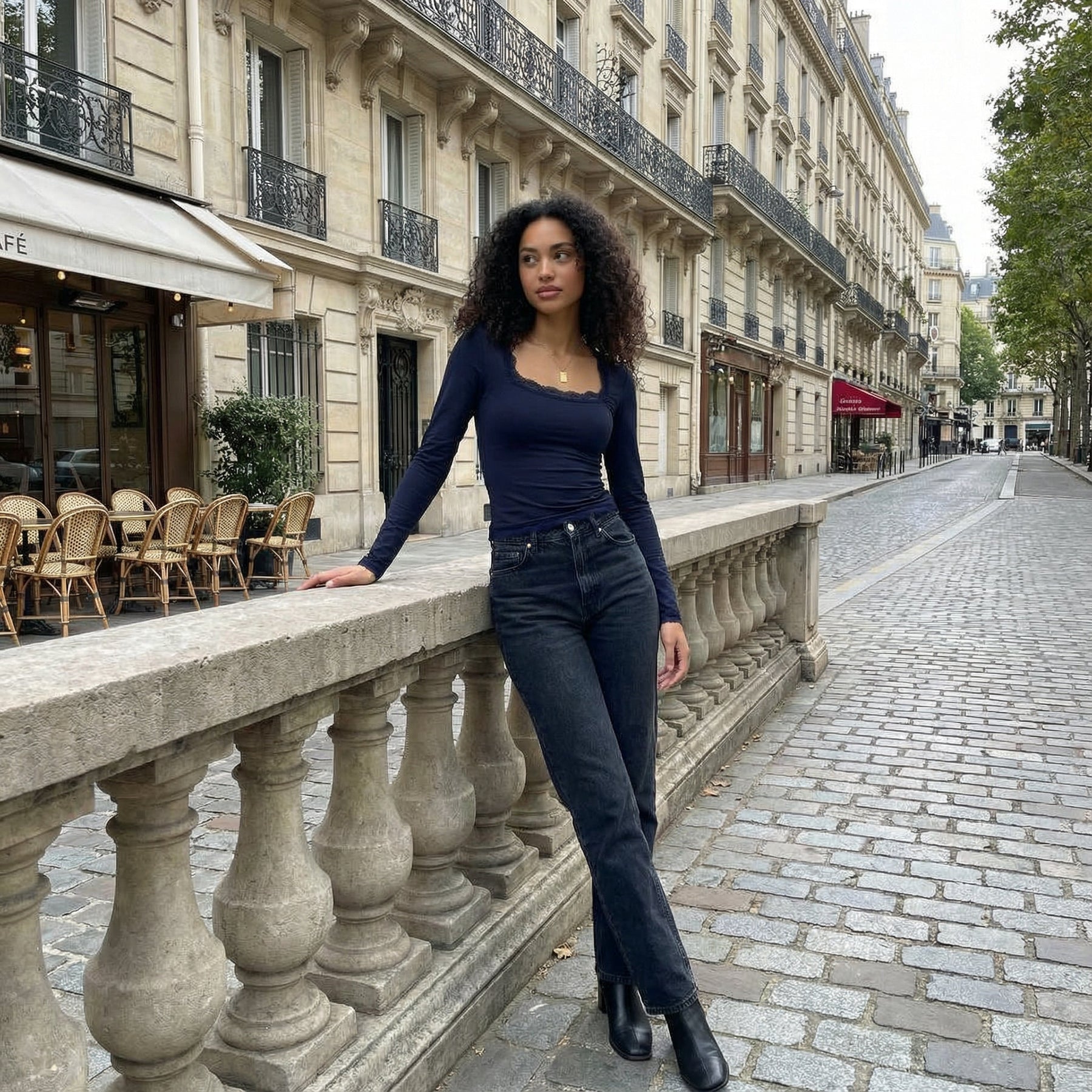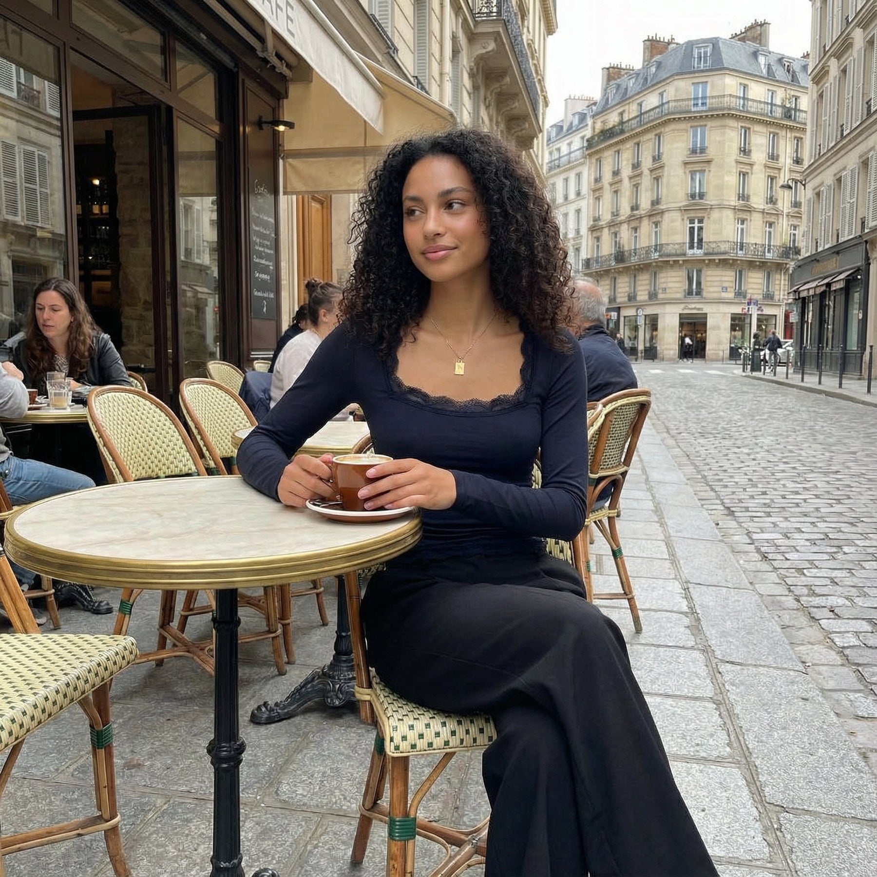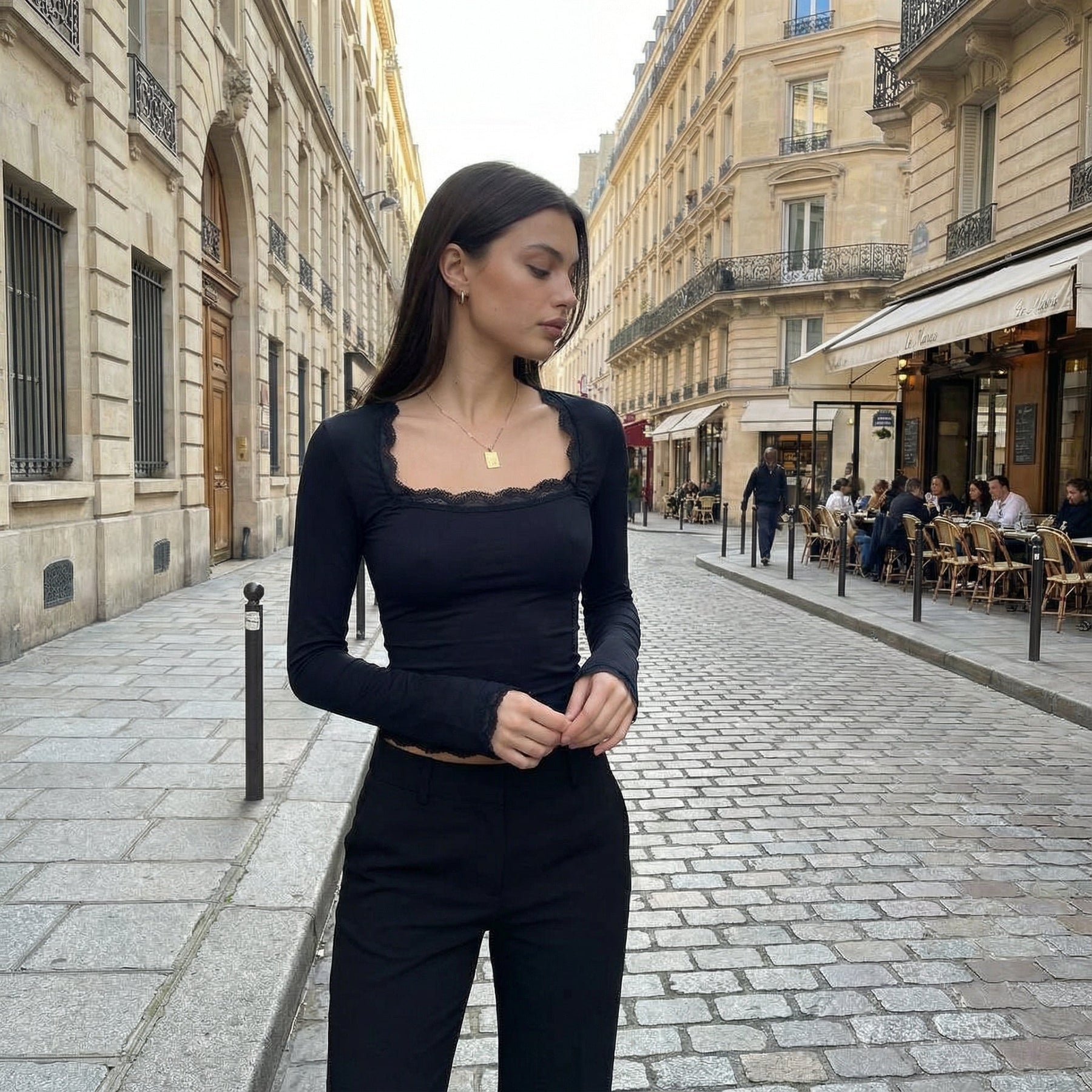 Crafted from the softest, stretchy fabric, this top offers a flattering, body-hugging fit with delicate lace detailing along the edges. Elegant and feminine, it’s perfect for both casual and dressy looks. The material may appear slightly sheer; the model wears nipple covers underneath. True-to-size fit; model wears XS/S.
