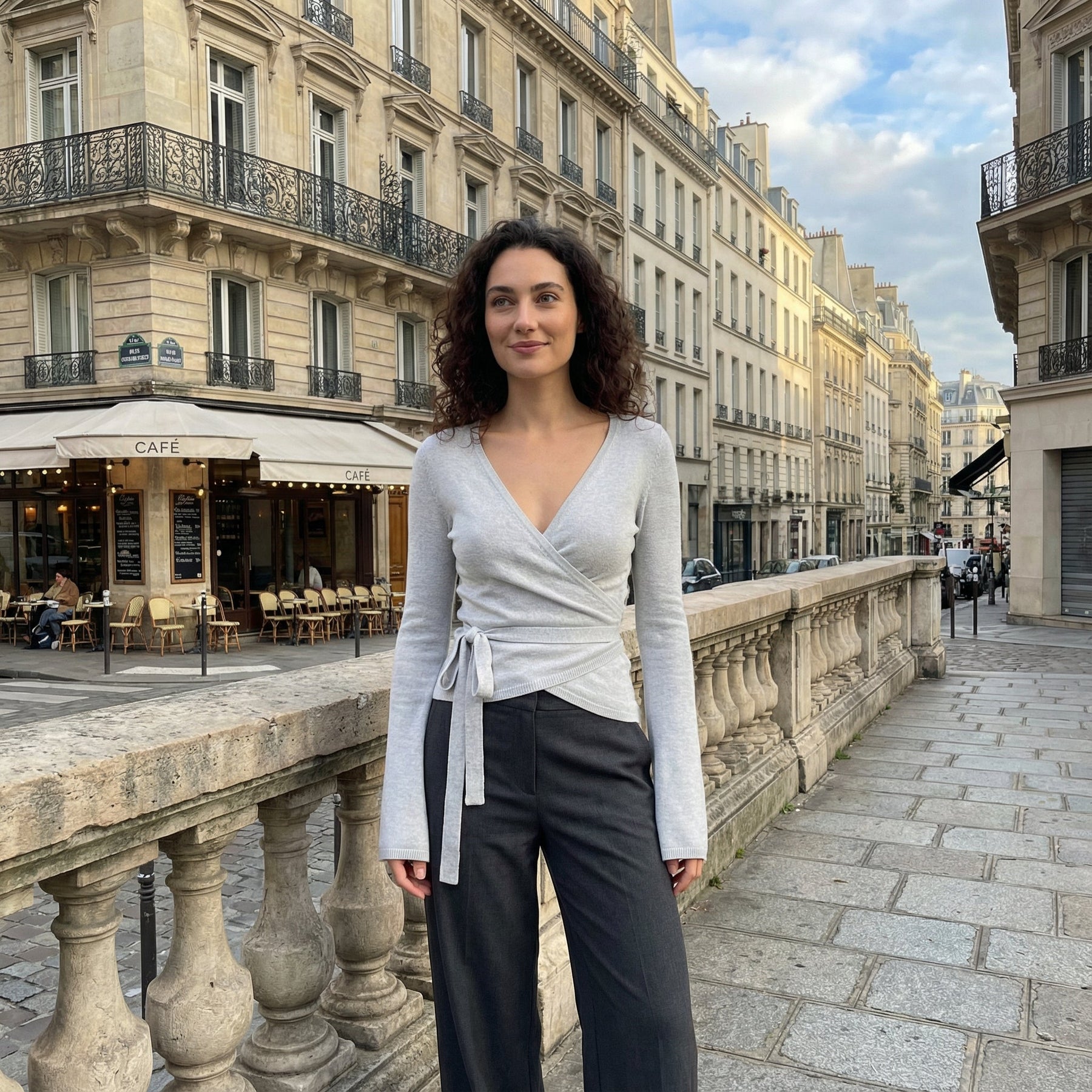 Enjoy a soft, stretchy knit wrap top that fits the body perfectly. Featuring long sleeves and a deep neckline, this versatile piece can be styled for both casual and dressy occasions. Regular fit; model wears XS/S with nipple covers underneath.