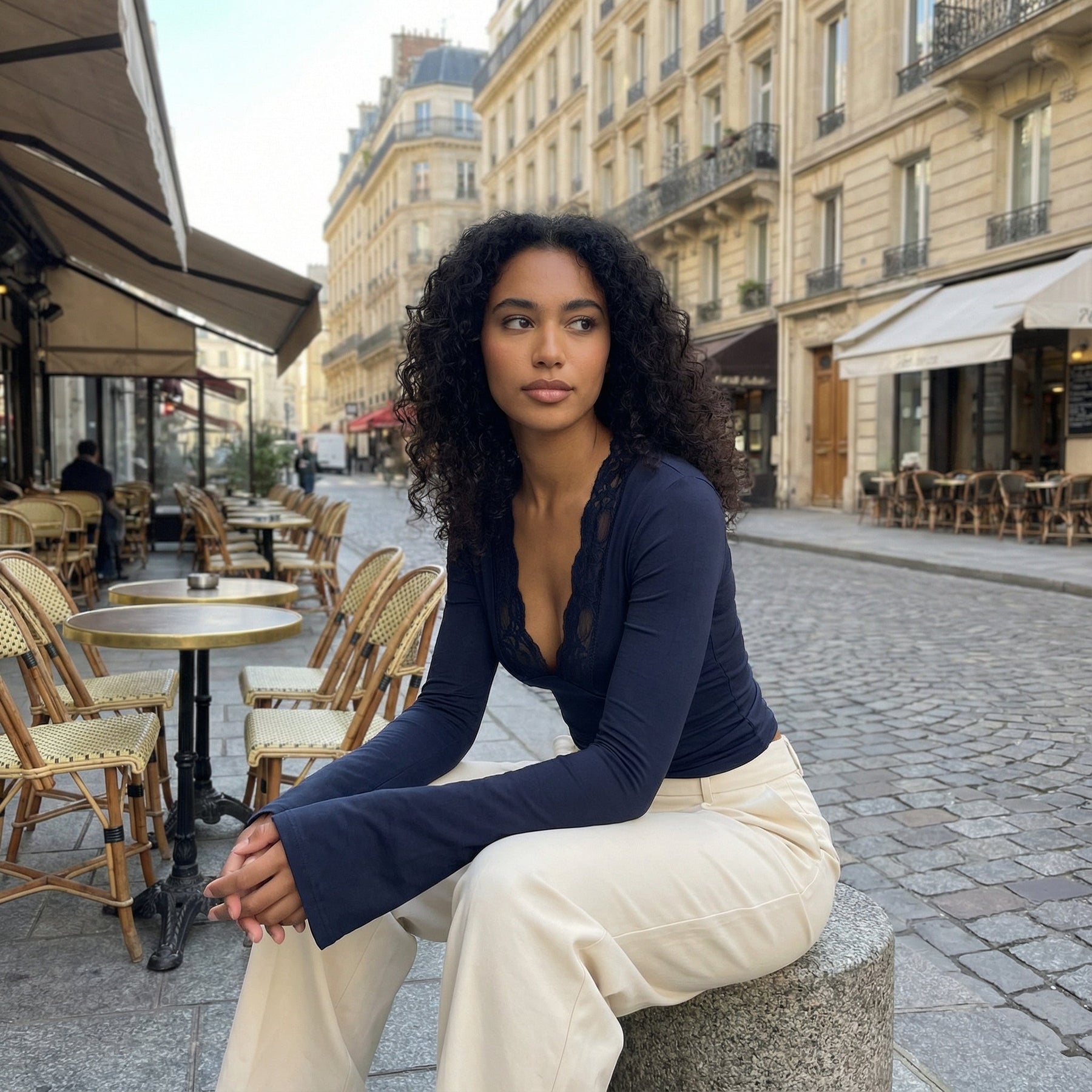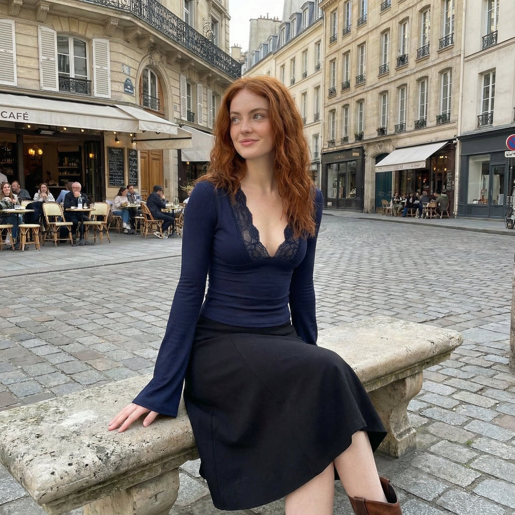 This elegant top features delicate lace edging and is crafted from a soft, stretchy fabric that hugs the body beautifully. With its deep neckline and long sleeves, it combines comfort and femininity for a timeless, flattering look. Regular fit; model wears XS/S.