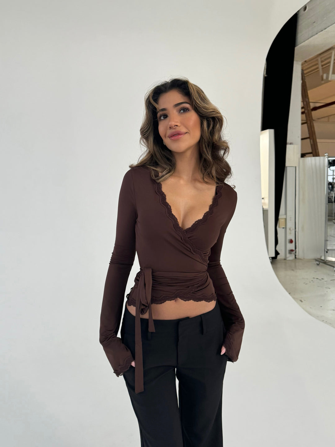 Lara lace long sleeve top - dark brown