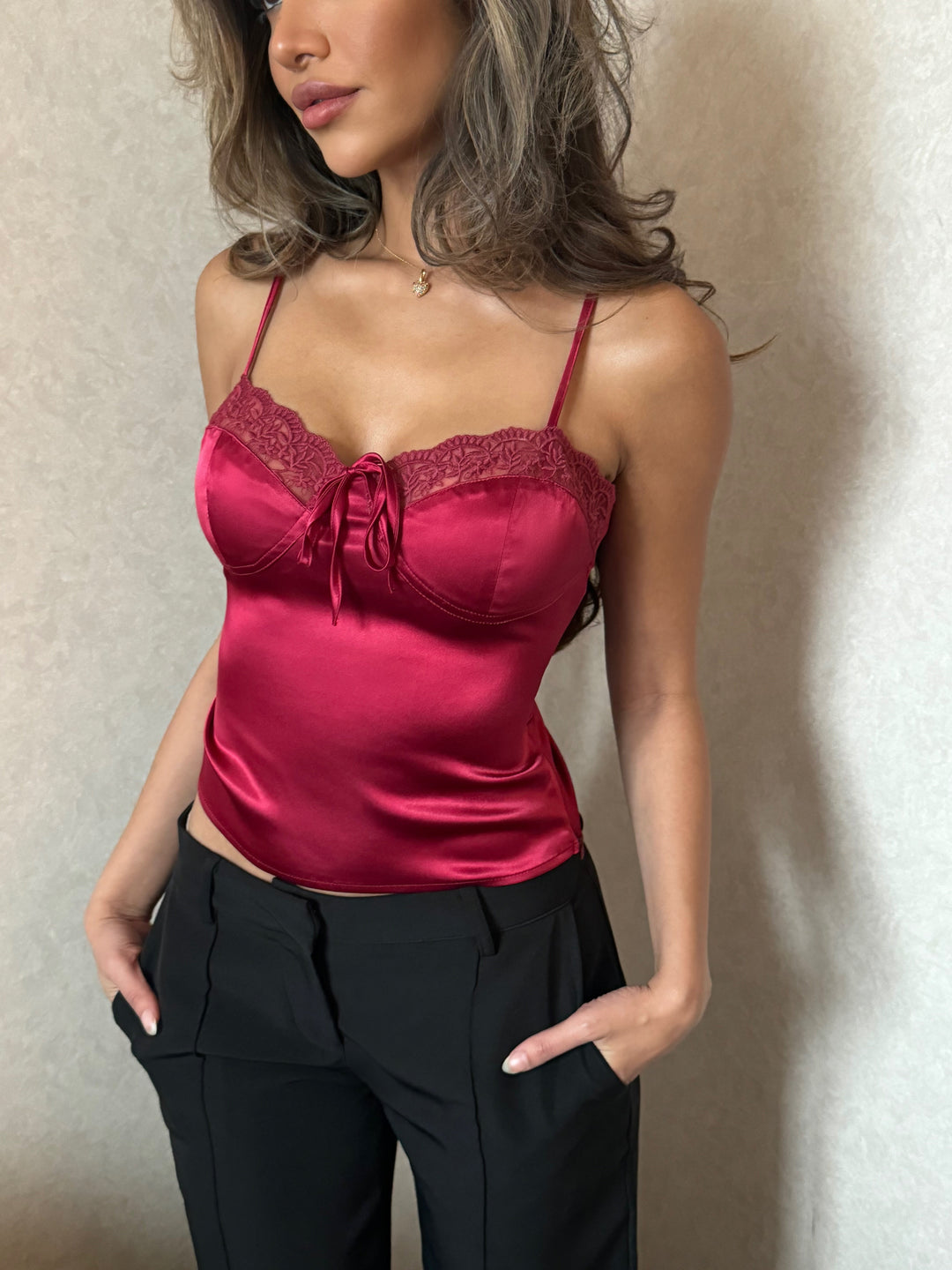 Silky lace top - dark red