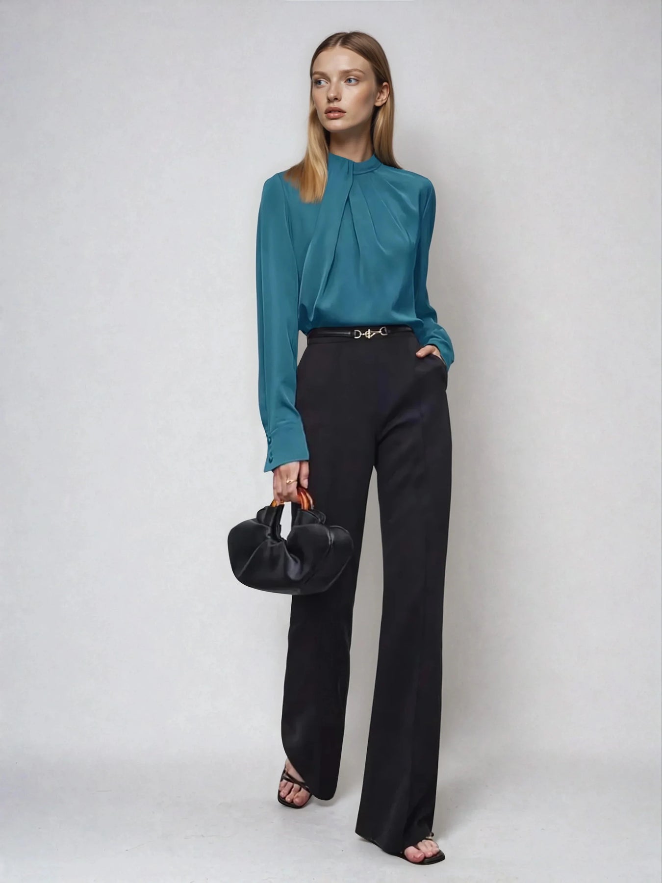 Elegant and versatile, the Asymmetric Ruched Stand Collar Top in navy elevates office wear with quiet luxury and timeless elegance. Clean lines meet refined texture through asymmetric ruching, pleated, and plicated details. The crisp stand collar frames the face with minimalist appeal, while the unlined silhouette keeps the look modern and effortless. This piece embodies old money style in a refined, wearable form.
